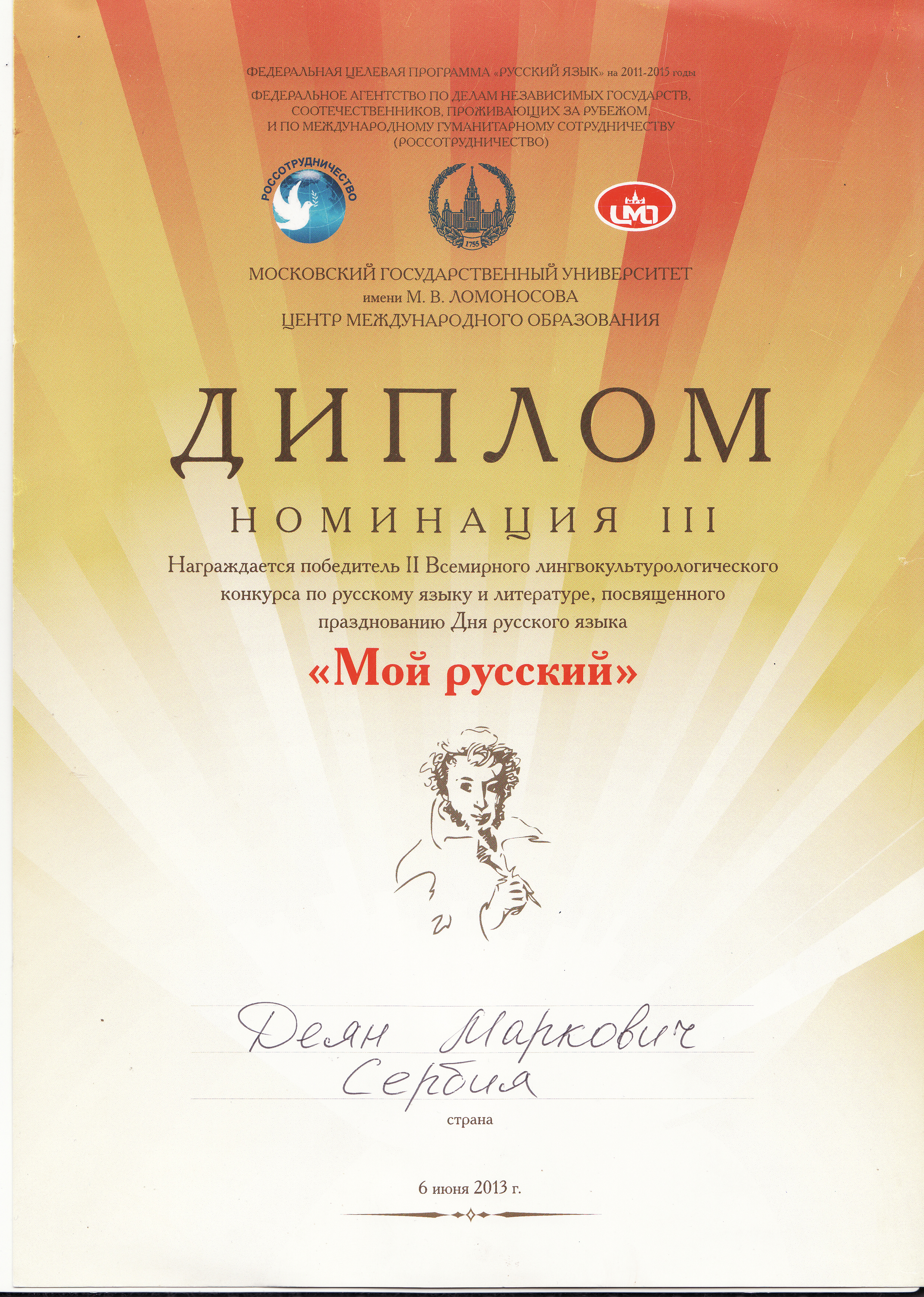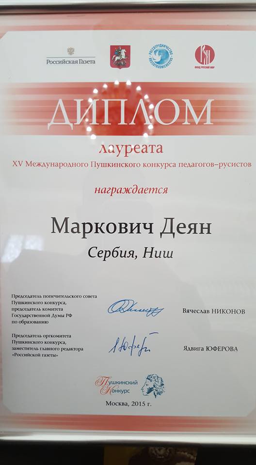 Лауреат је престижног XV Међународног Пушкинског такмичења Руски језик као језик победе (Москва, 6.06.2015). Организатори овог такмичења су "Россијскаја газета" и Влада Москве, а оно се организује уз подршку Министарства иностраних послова Руске Федерације и фонда "Руски свет".
