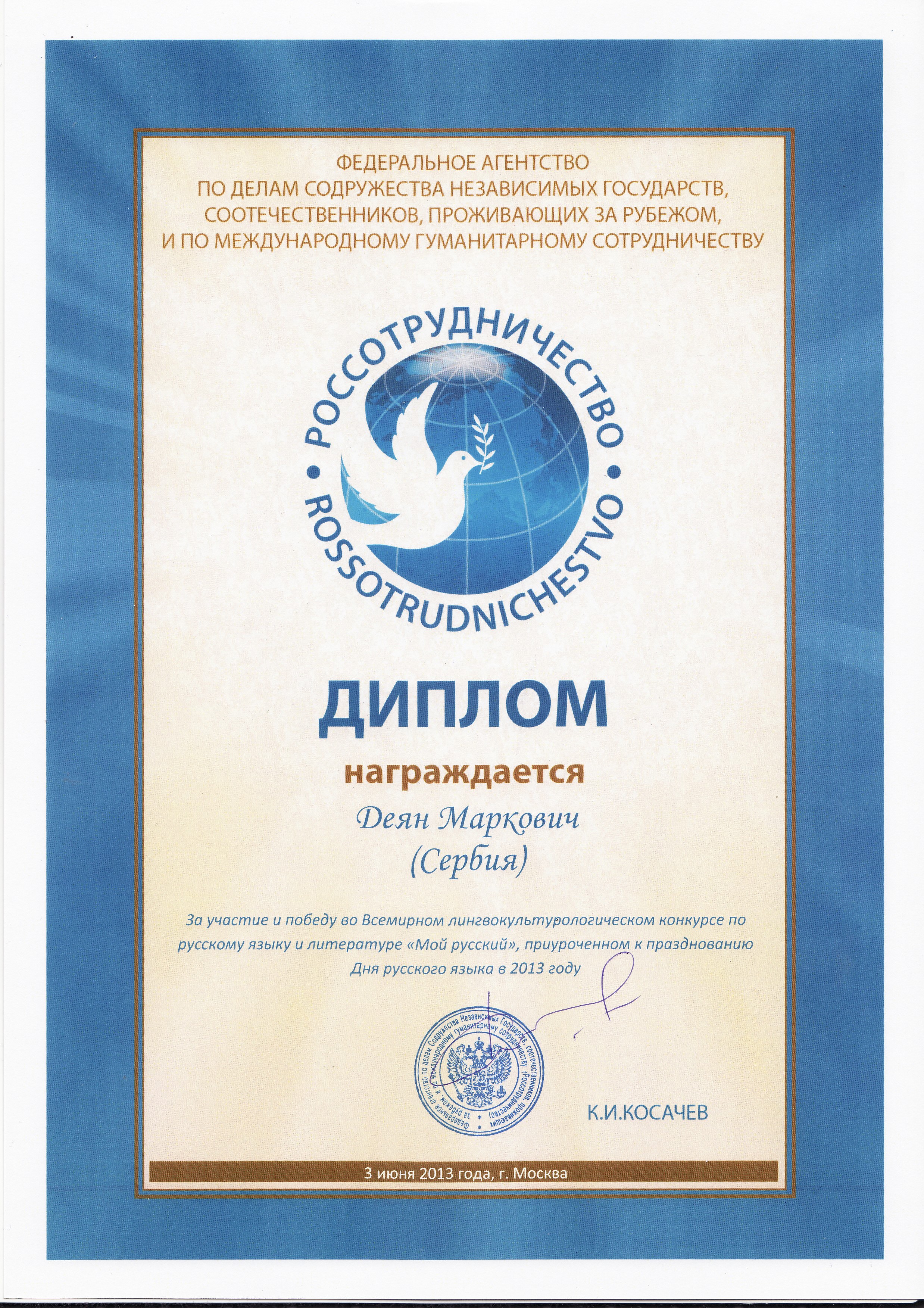 Када је Министарство иностраних послова Руске Федерације заједно са Министарством образовања и науке Руске Федерације организoвало у периоду од 27. новембра до 1. децембра 2012. године III Светски Форум истакнутих иностраних дипломаца који су своје студије завршили у бившем Совјетском Савезу и Русији, из Републике Србије је у Москву, на предлог и о трошку Владе Руске Федерације, позван Дејан Марковић као члан Президијума округлог стола Руски језик и руска култура у савременом свету, а наступио је и са рефератом Настава руског језика у Србији, актуелни проблеми у вези са скраћивањем часова и могући путеви за њихово решавање. Свечано отварање Форума одржано је у Колоном залу Дома Сојузов, уз присуство најужег руководства Руске Федерације.