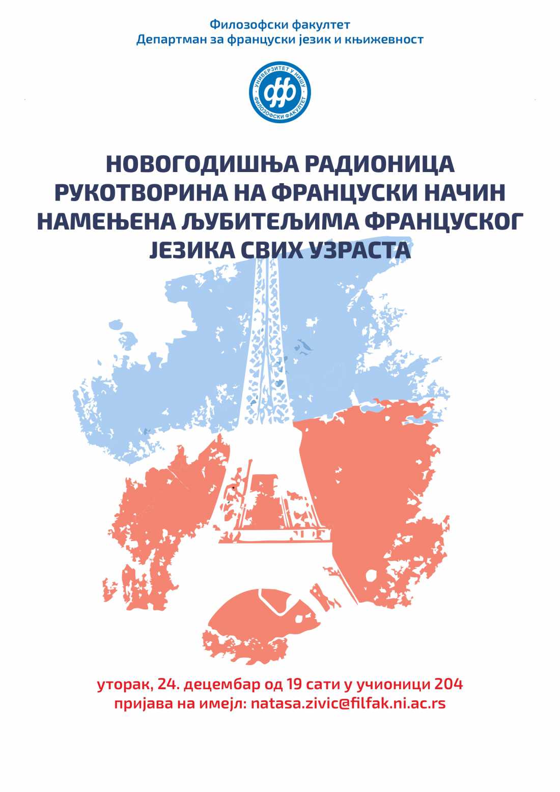 Са задовољством позивамо франкофиле свих узраста да нам се придруже на Новогодишњој радионици рукотворина на француски начин, 24. децембра од 19 сати у сали 204. Заједно ћемо креативним радом и у празничном расположењу симболично испратити веома успешну годину за нас. Добро нам дошли!