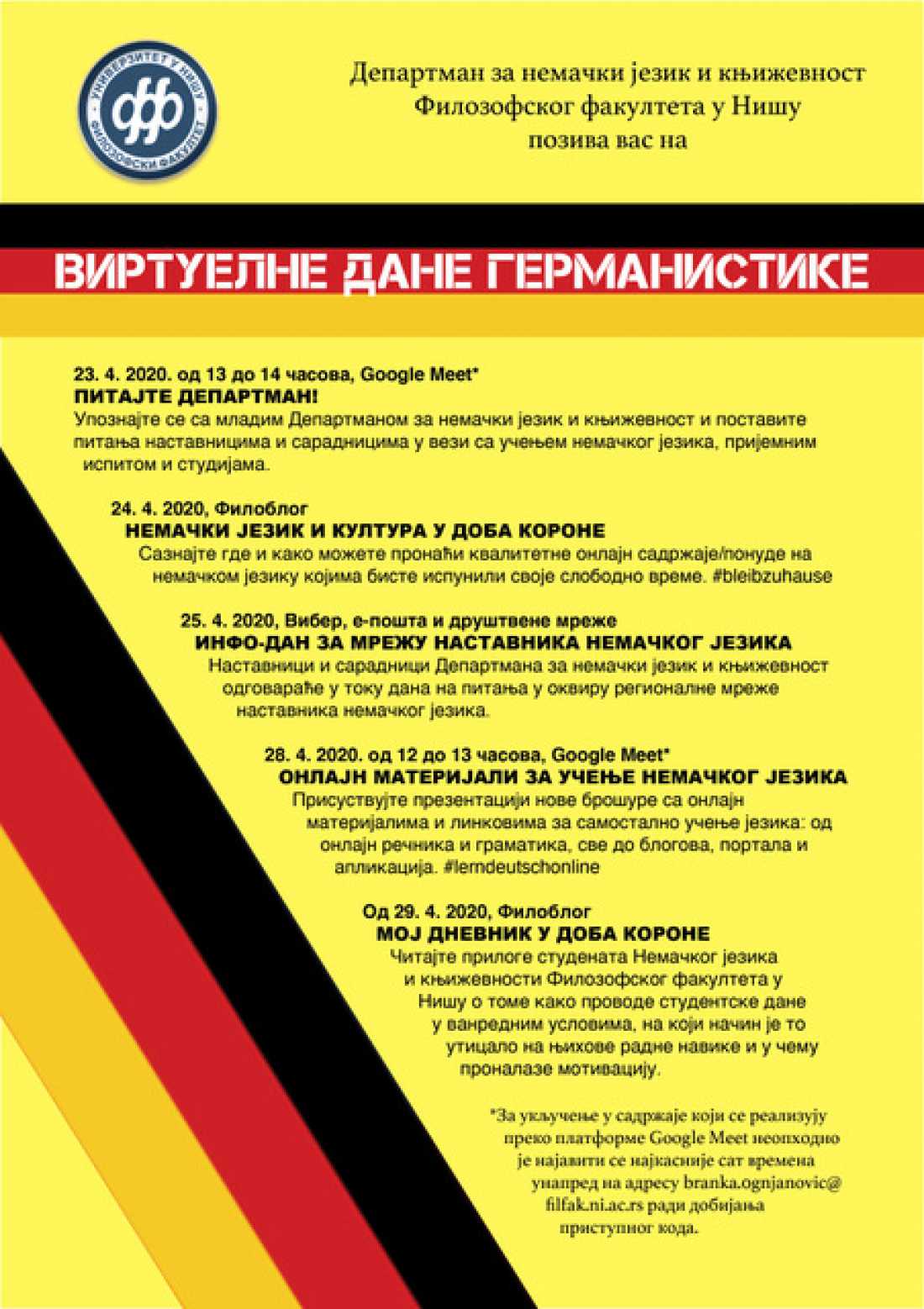 Департман за немачки језик и књижевност Филозофског факултета у Нишу припремио је виртуелне Дане Германистике који ће се одржати од 23. до 29. априла 2020. године.