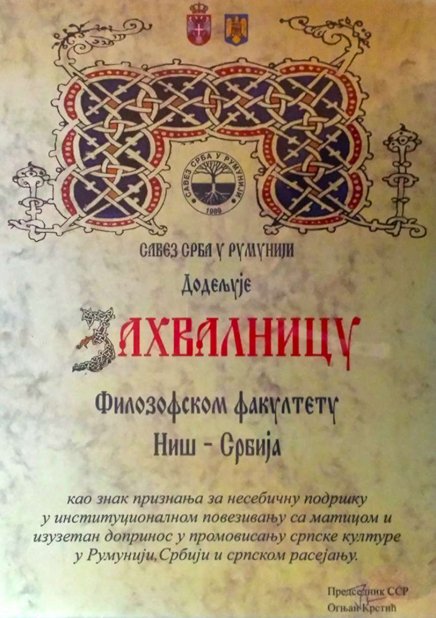 Савез Срба у Румунији доделио је ЗАХВАЛНИЦУ Филозофском факултету Универзитета у Нишу као знак признања за несебичну подршку у институционалном повезивању са матицом и изузетан допринос у промовисању српске културе у Румунији, Србији и српском расејању.