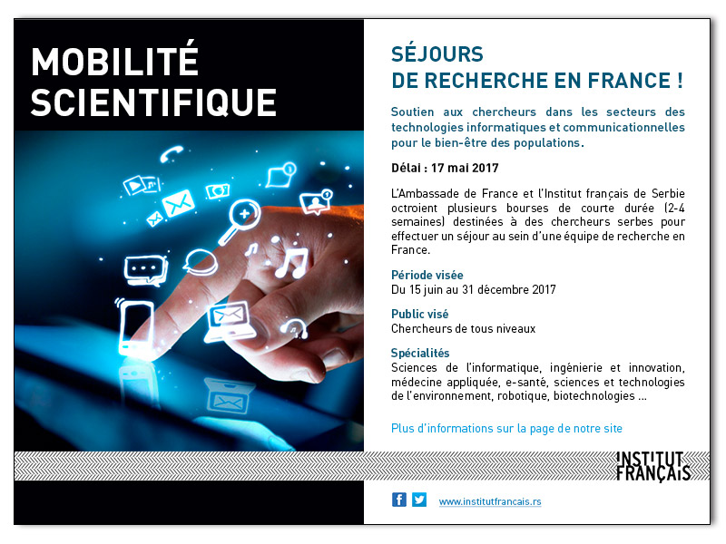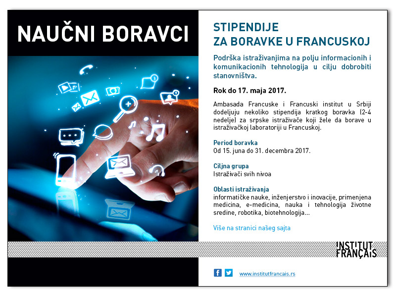 Aмбасада Француске и Француски институт у Србији додељују стипендије кратког боравка за српске истраживаче који желе да бораве у истраживачкој лабораторији у Француској у периоду од 15. јуна 2017. до 31. децембра 2017.