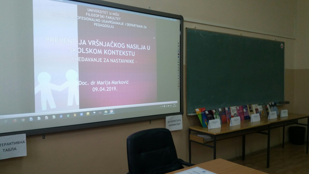 У оквиру недеље Департмана за педагогију, а у организацији Центра за професионално усавршавање Филозофског факултета у Нишу, доц. др Марија Марковић одржала је интерактивно предавање за наставнике основних и средњих школа на тему Превенција вршњачког насиља у школском контексту.