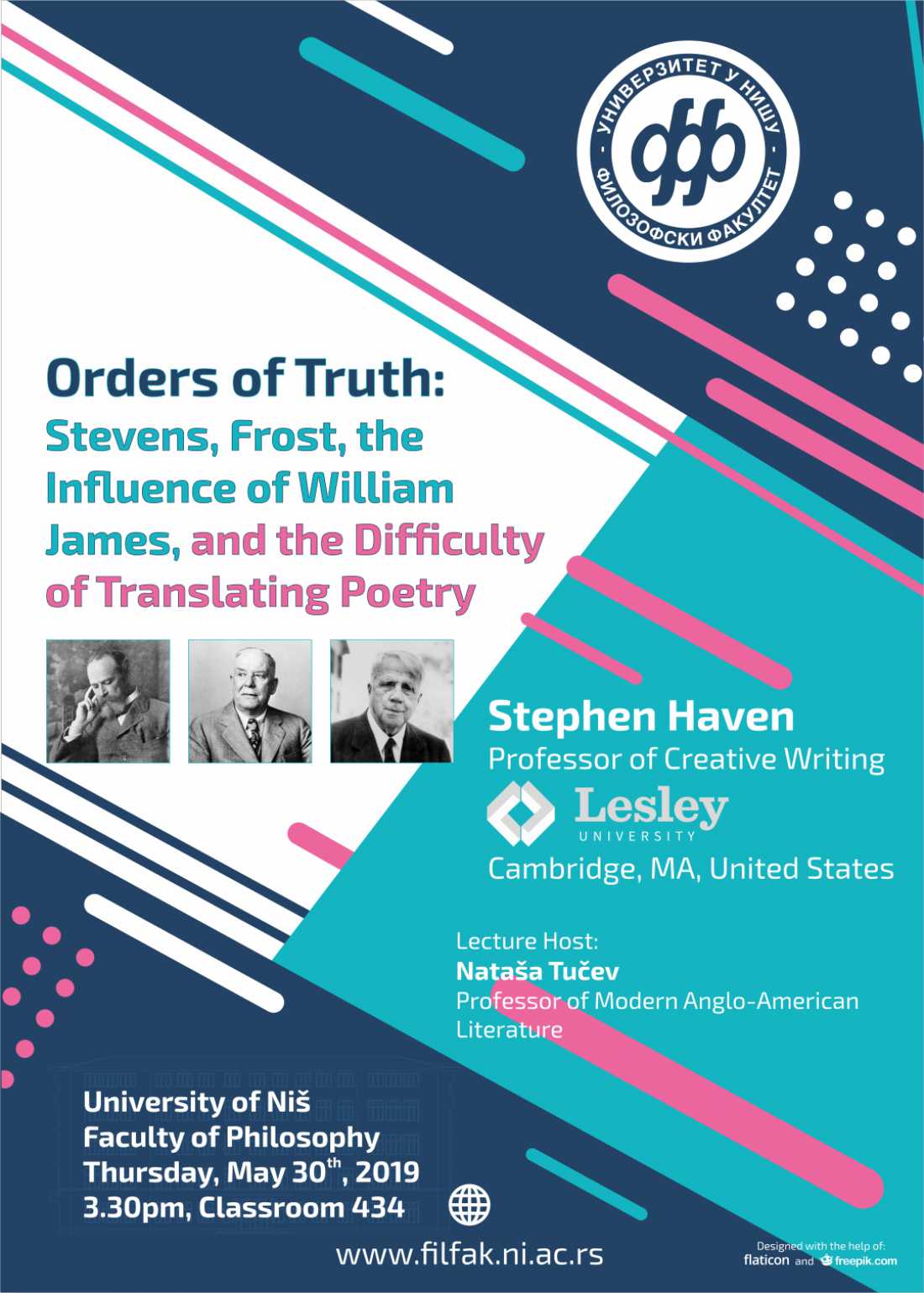 Професор Стивен Хејвен са Универзитета Лесли у Масачусетсу, САД, одржаће предавање на тему Orders of Truth: Stevens, Frost, the Influence of William James, and the Difficulty of Translating Poetry. Предавање организује Департман за англистику Филозофског факултета у Нишу.