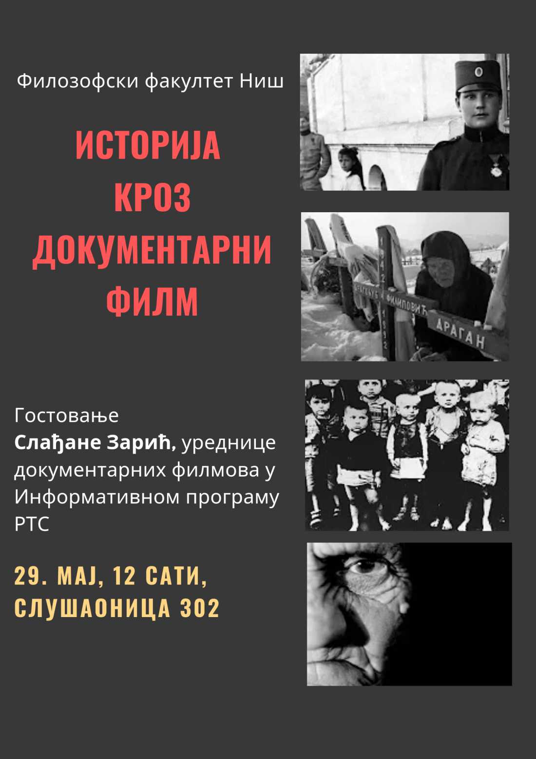 Гост Филозофског факултета у Нишу биће Слађана Зарић, уредница документарних филмова у информативном програму РТС. Она ће одржати предавање на тему Историја кроз документарни филм.