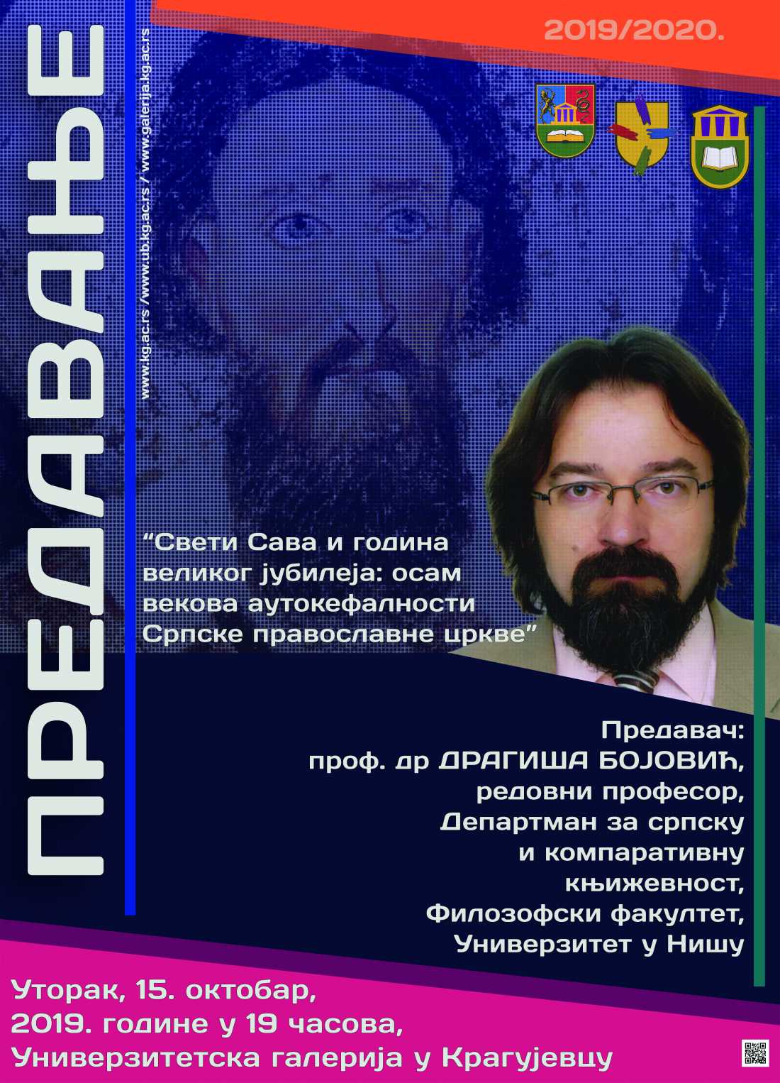 Проф. др Драгиша Бојовић, редовни професор на Департману за српску и компаративну књижевност Филозофског факултета у Нишу, одржаће на Универзитету у Крагујевцу (просторије Универзитетске галерије) предавање ''Свети Сава и година великог јубилеја: осам векова аутокефалности Српске православне цркве'', у уторак 15. октобра 2019. године, са почетком у 19 сати.