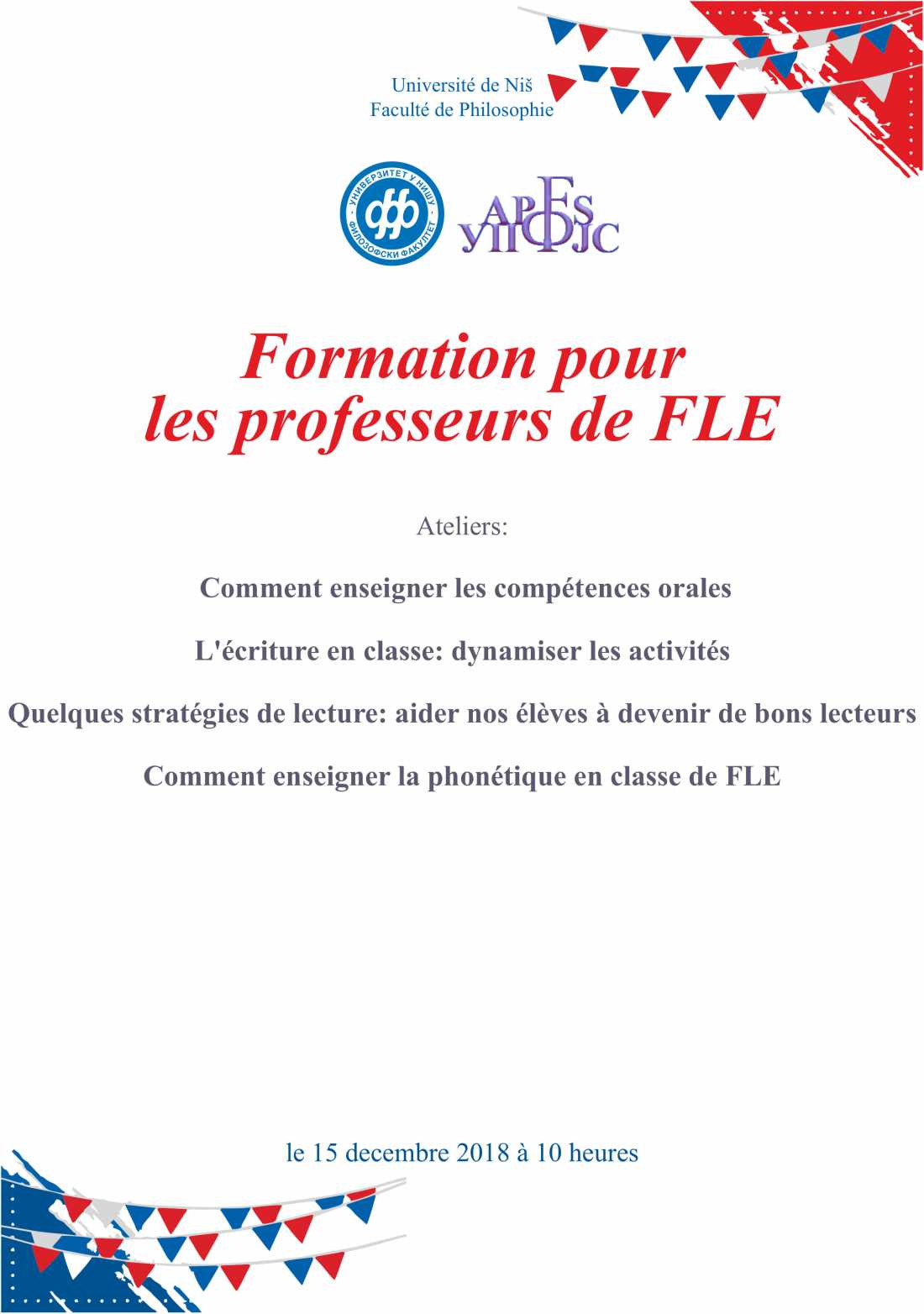 Филозофски факултет у Нишу и Удружење професора француског језика Србије организују семинар Континуирано усавршавање професора француског језика, 15. децембра 2018. године са почетком у 10 сати.