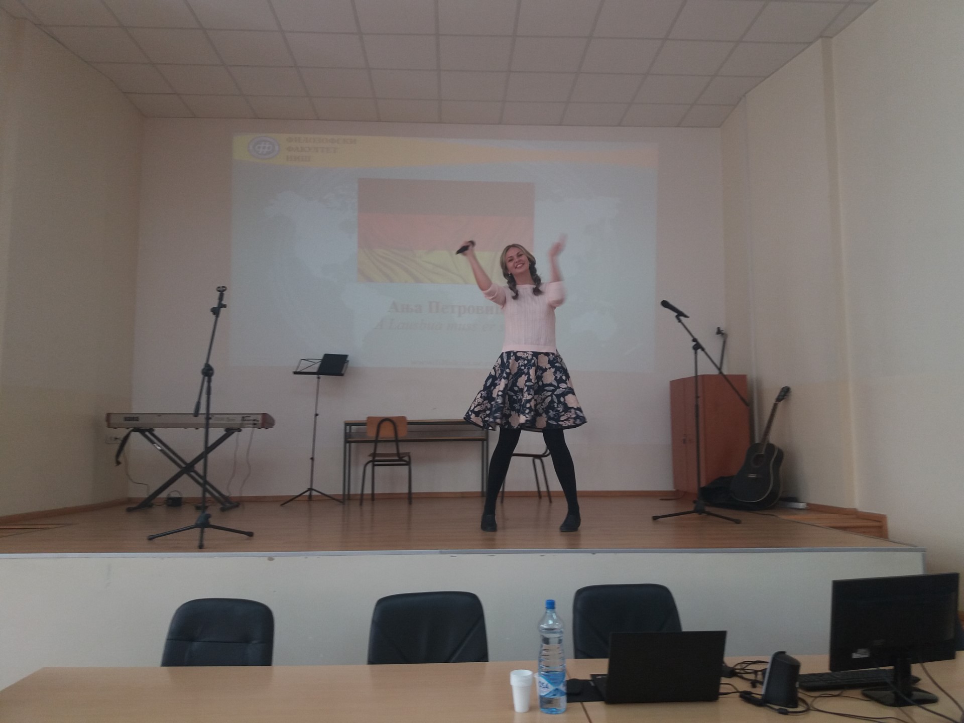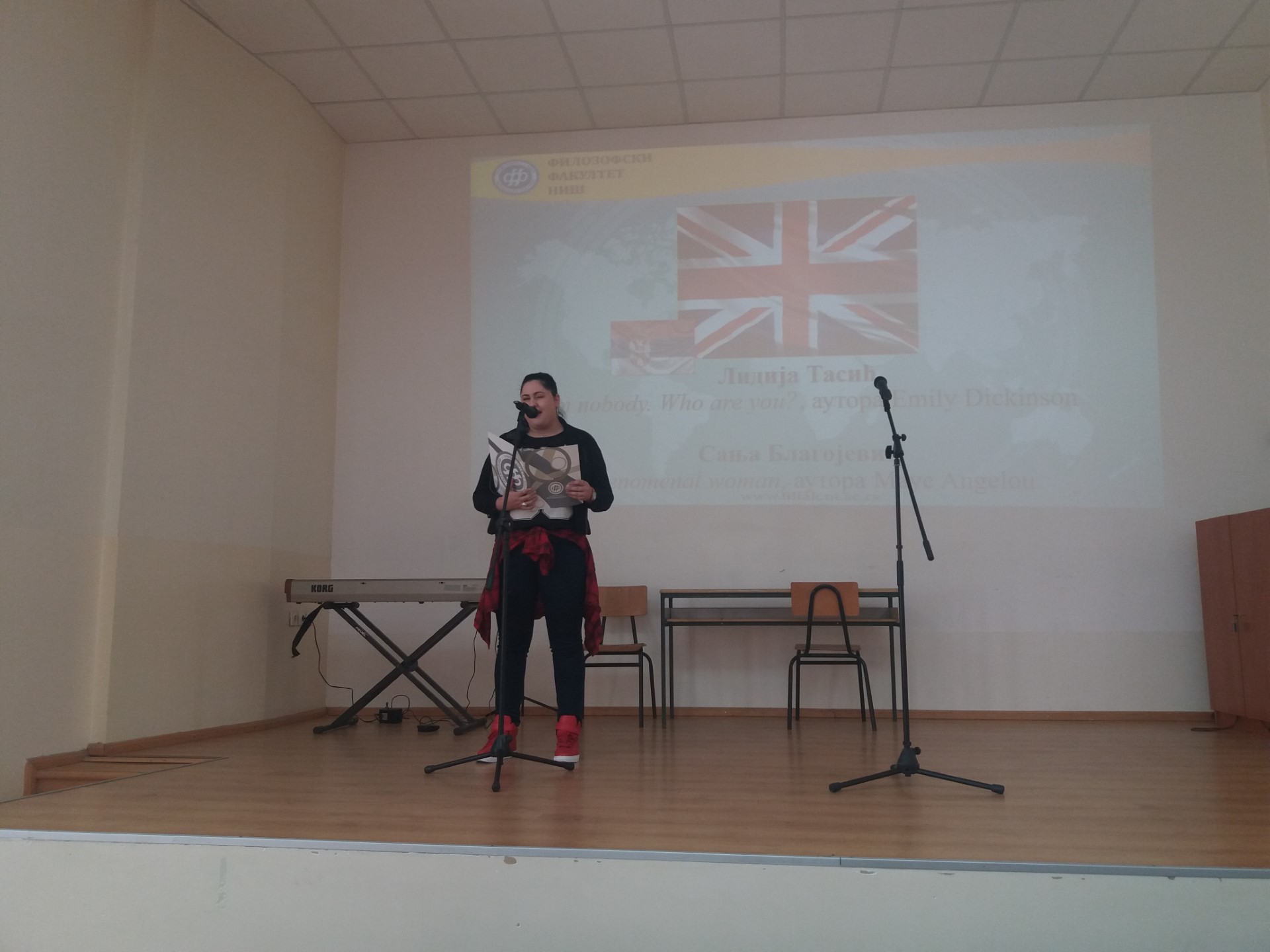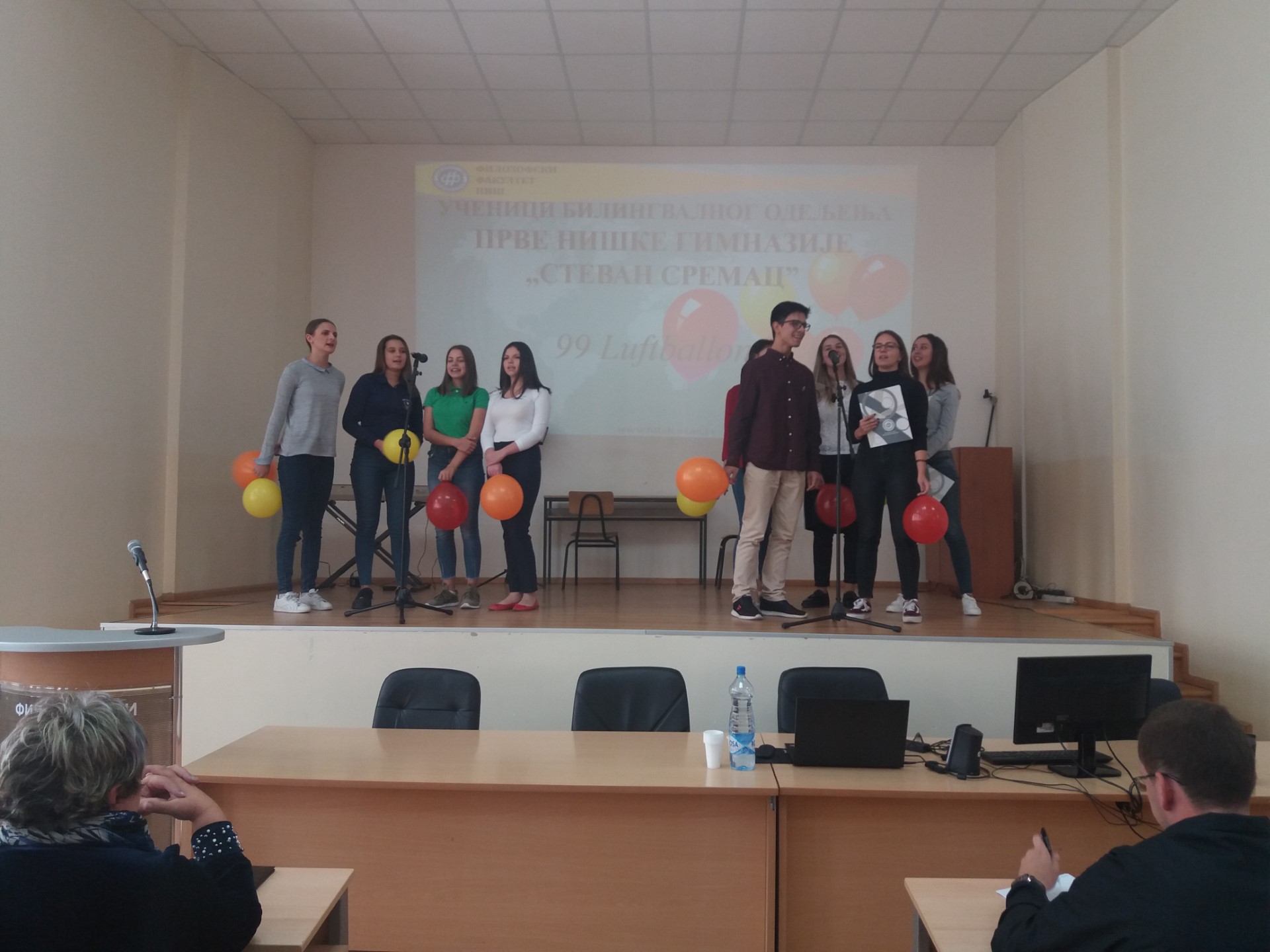 Иако је испитни рок увелико у току, велики број студената, али и ученика гимназије "Стеван Сремац", са задовољством се укључио у креативан и динамичан перформанс који је изазвао велико одушевљење публике. Након уводног обраћања деканице проф. др Наталије Јовановић која је указала на значај бројних филолошких департмана и важност изучавања језика у савременом друштву, кренуле су песме, рецитације, али и скечеви на српском, енглеском, француском, руском, грчком, бугарском, немачком. Иако се тренутно јапански не изучава на Филозофском факултету, присутни су имали прилику да чују извођење песме и на овом језику, а програм је спектакуларно завршен чувеним плесом сиртаки.