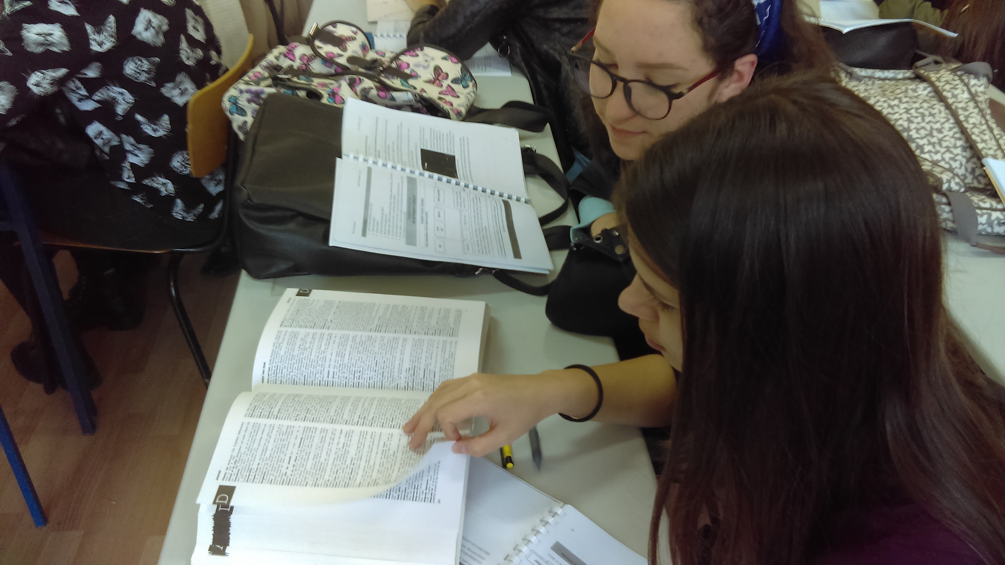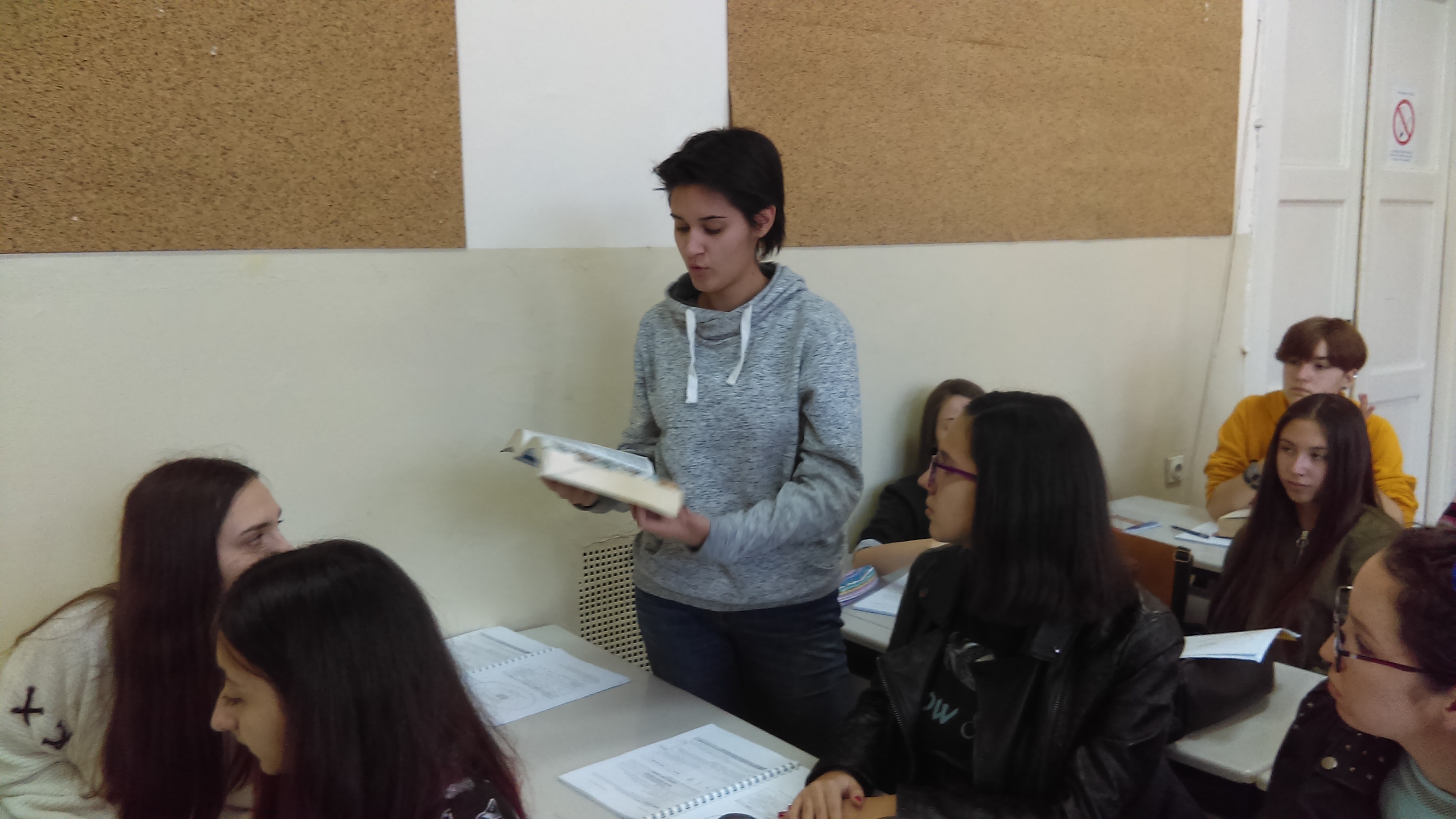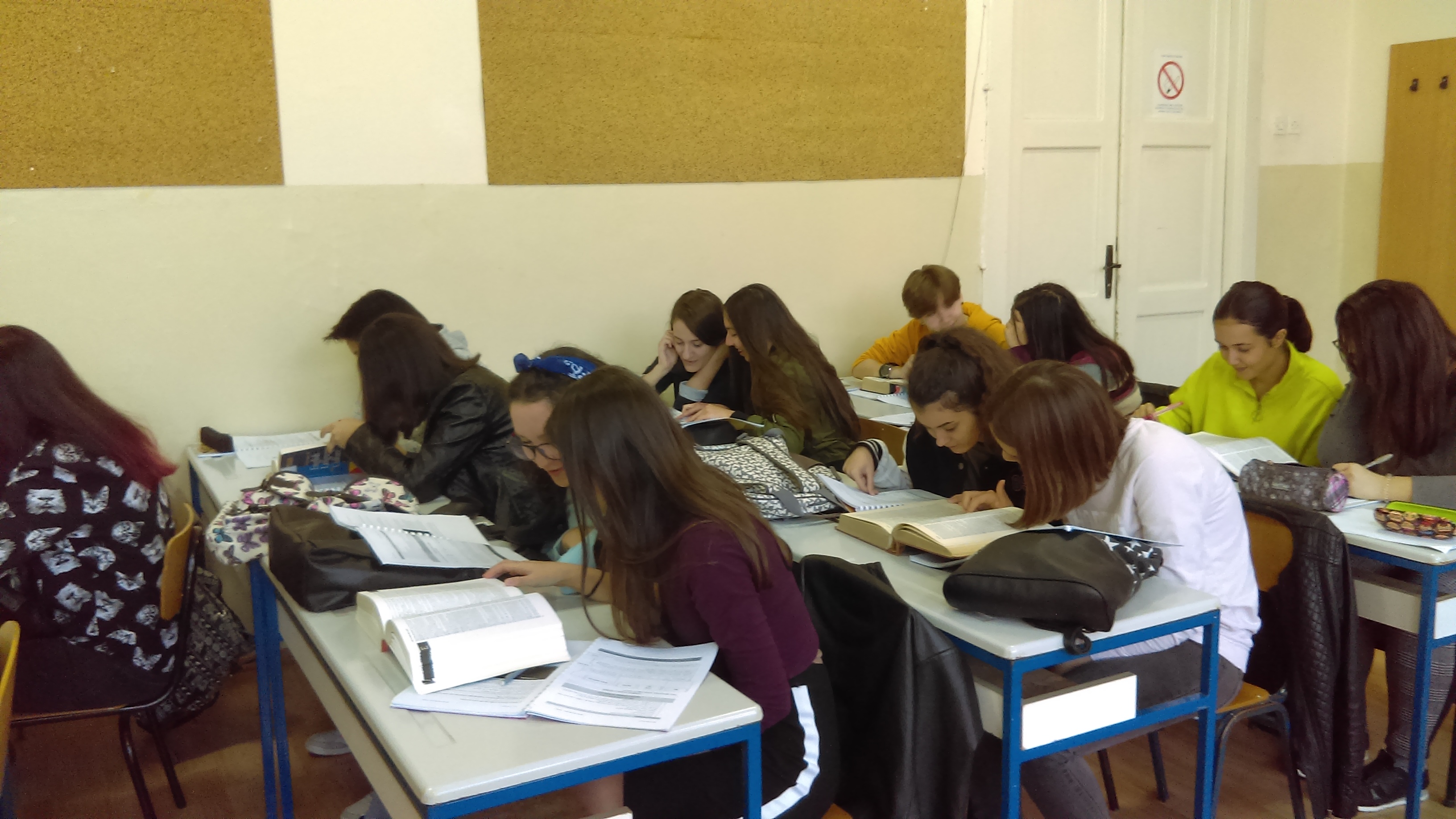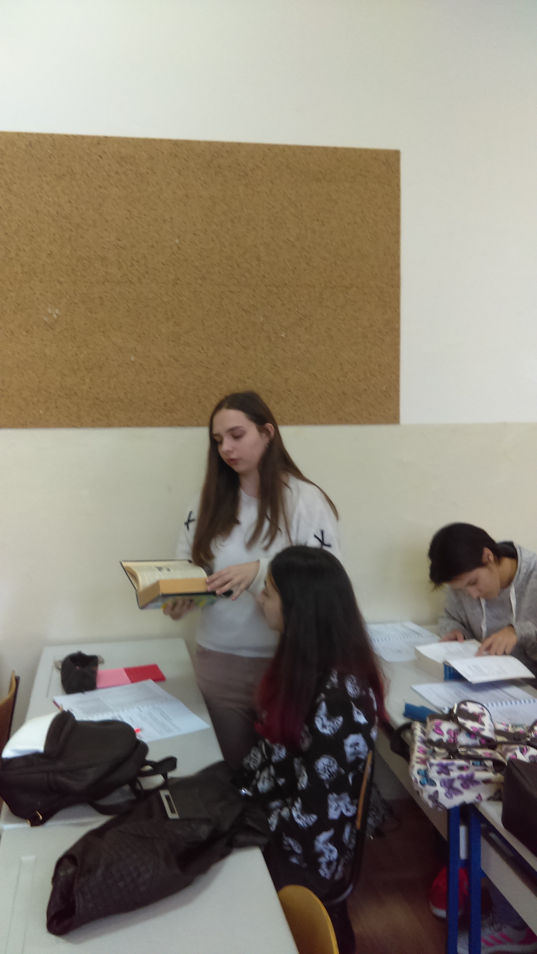 Потом су ученици имали час из предмета Основи превођења на Факултету на коме су се упознали са речницима из библиотеке и разговарали о коришћењу референтне литературе као помагала у раду преводиоца.