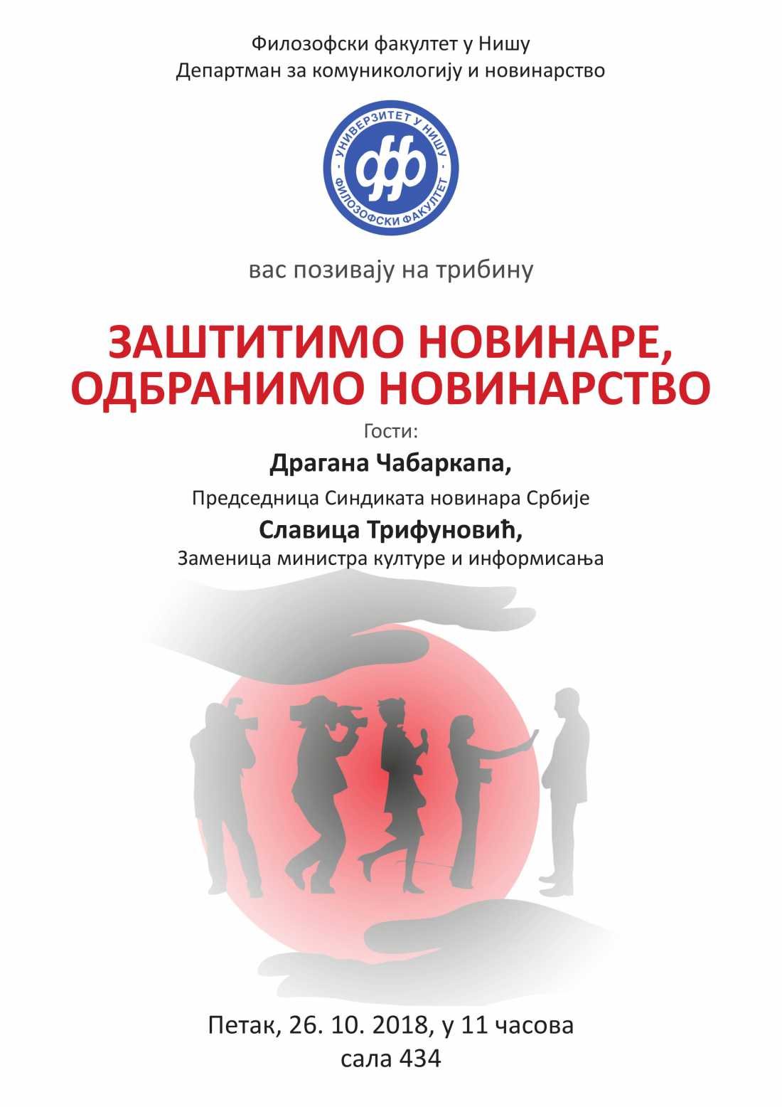 Филозофски факултет у Нишу и Департман за комуникологију и новинарство вас позивају на трибину Заштитимо новинаре, одбранимо новинарство