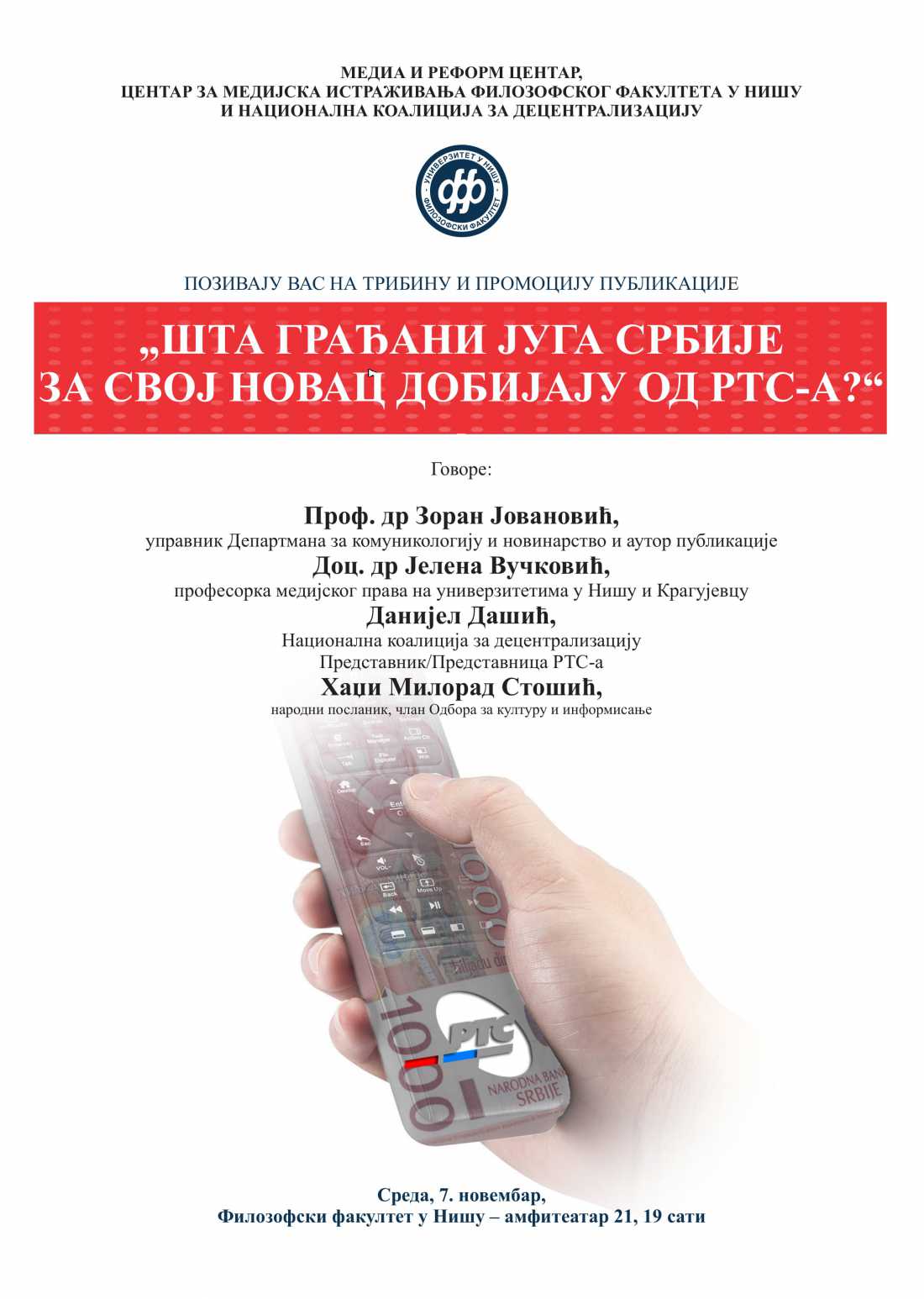 Медиа и реформ центар, Центар за медијска истраживања Филозофског факултета у Нишу и Национална коалиција за децентрализацију позивају вас на трибину и промоцију публикације „Шта грађани југа Србије за свој новац добијају од Ртс-а?“