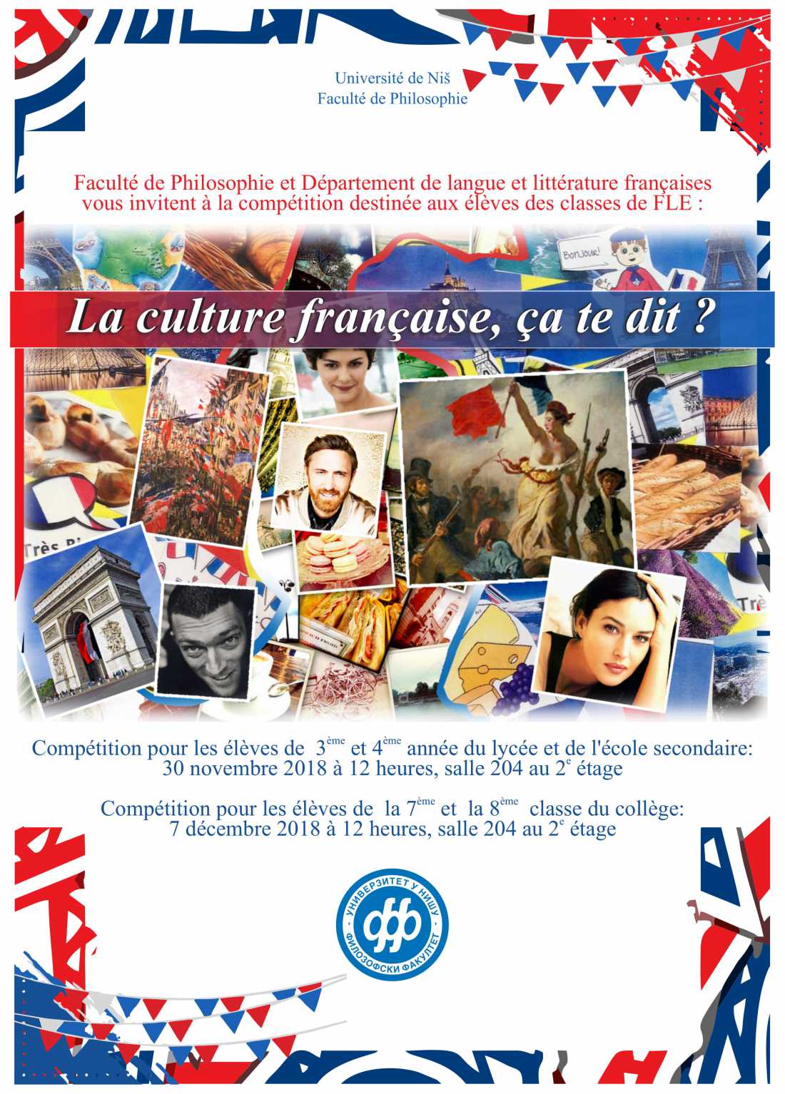 Филозофски факултет у Нишу и Департман за француски језик и књижевност организују такмичење у знању француског језика и културе за ученике гимназија, средњих и основних школа под називом „La culture française, ça te dit ?“ у следећим терминима: