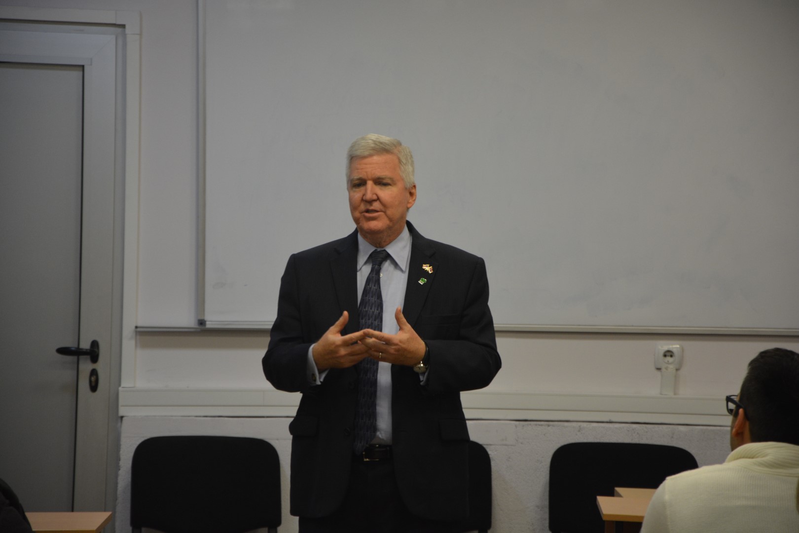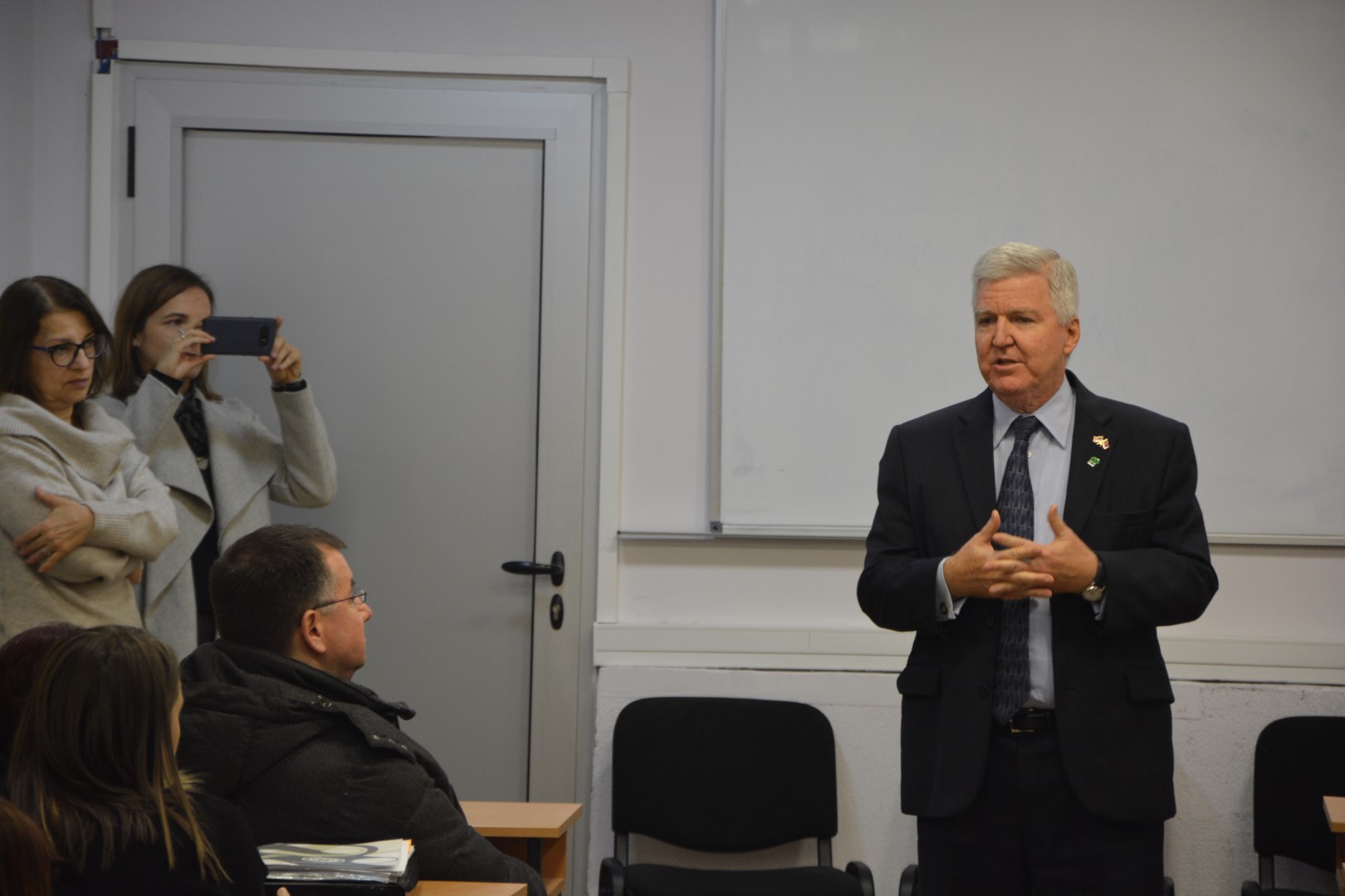 Одговарајући на питања студената о могућностима за студирање у САД, амбасадор је указао на програме размене које реализује Амбасада у Београду, али је истовремено и говорио о могућностима и начинима стипендирања иностраних студената од стране америчких универзитета.