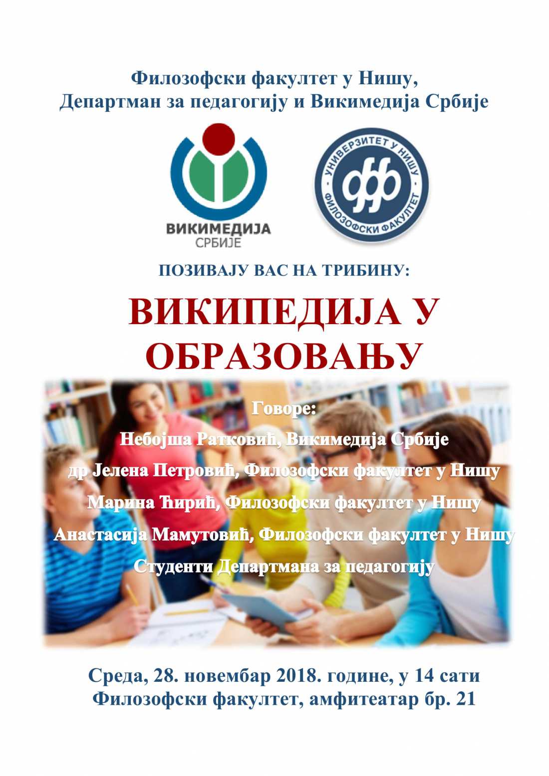 Департман за педагогију Филозофског факултета у Нишу и Викимедија Србије позивају вас на трибину "Википедија у образовању" која ће бити одржана у среду, 28. новембра, у 14 сати у амфитеатру 21.