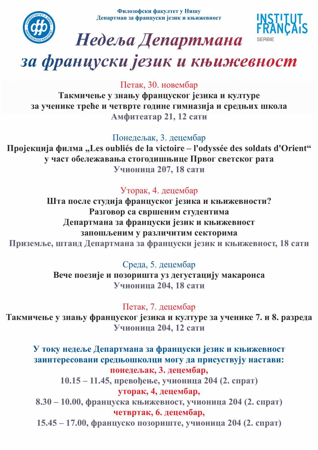 Департман за француски јези и књижевност обележавање своје недеље почео је такмичењем за ученике средњих школа и гимназија, а биће настављен низом активности од понедељка, 3. децембра.