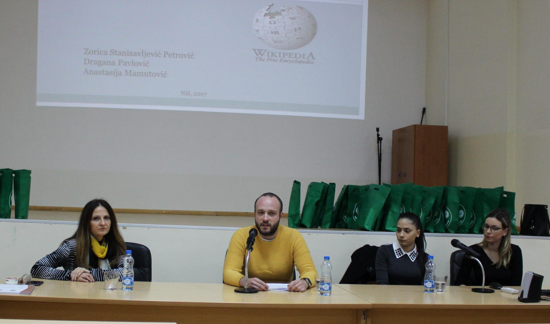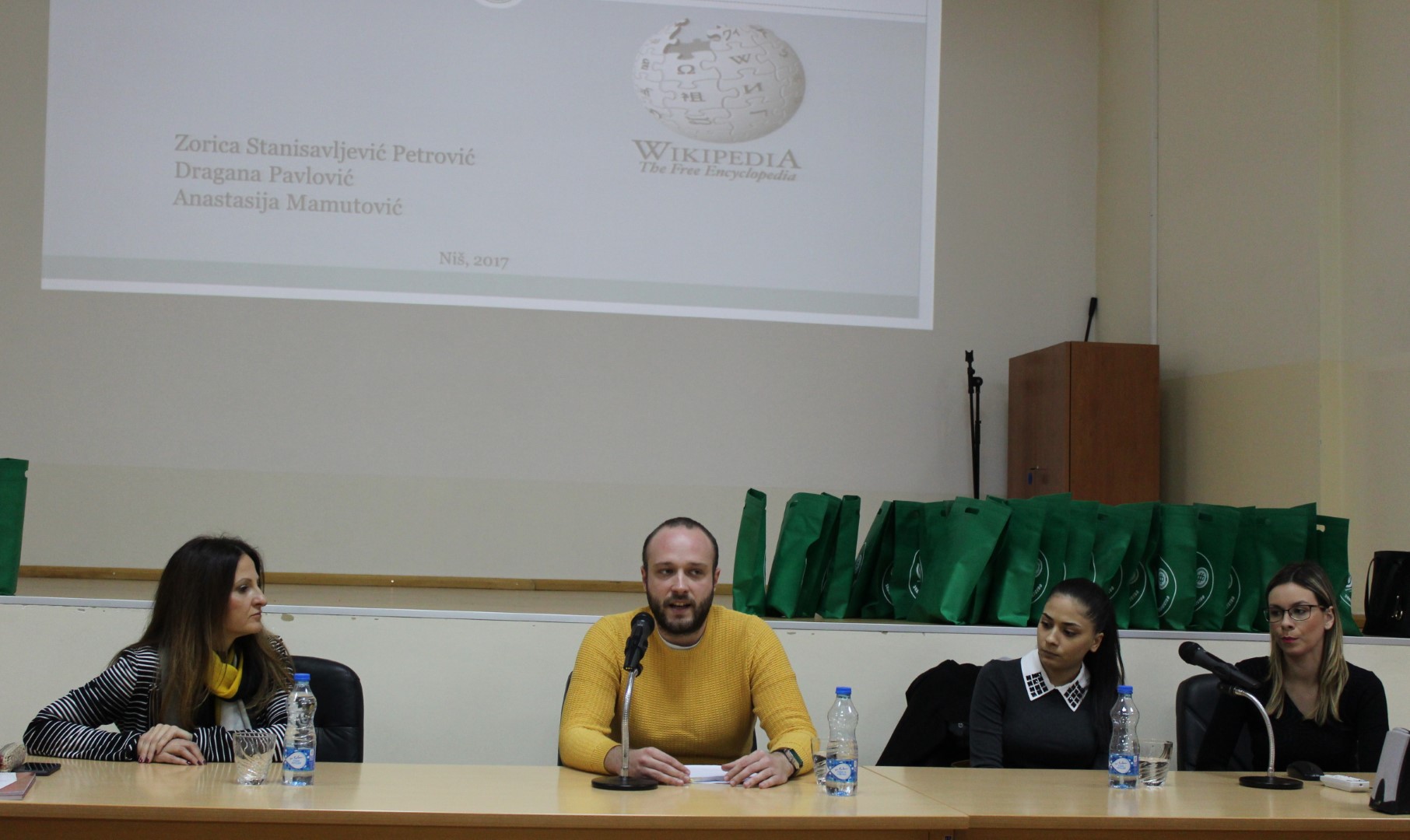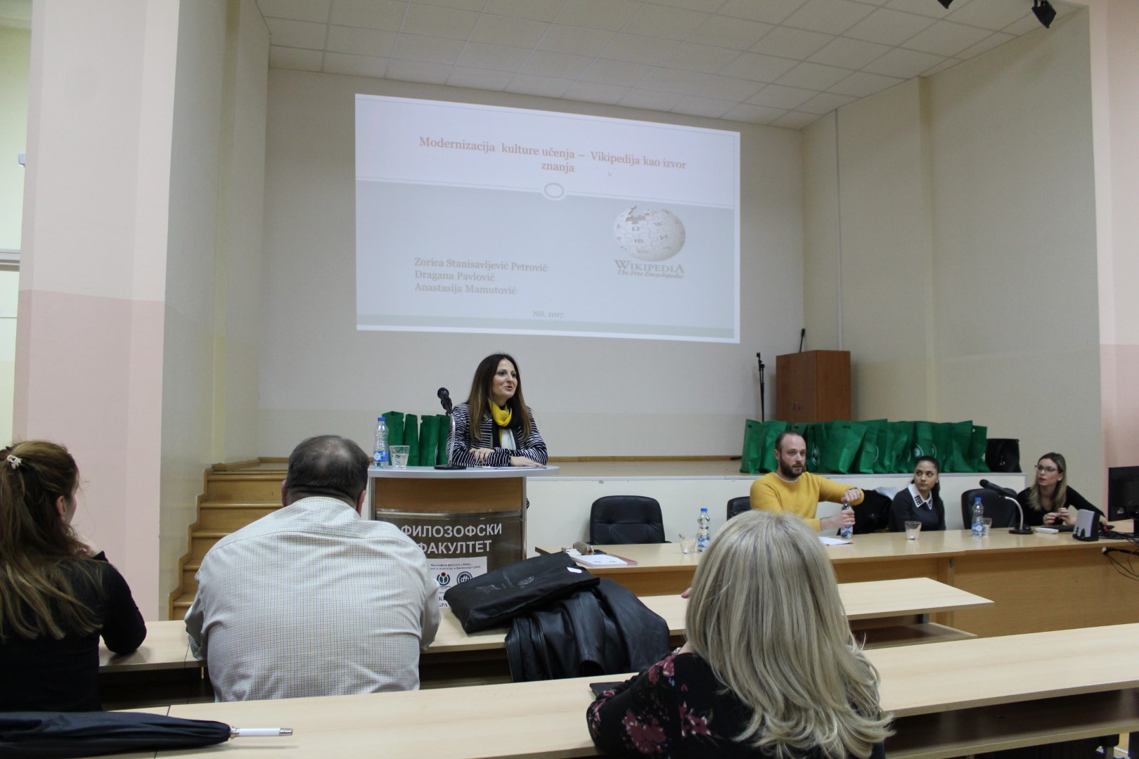 Википедија у образовању је назив занимљиве трибине коју су заједничким снагама организовали Департман за педагогију Филозофског факултета у Нишу и Викимедија Србије, а која је изазвала велико интересовање не само студената, већ и шире јавности.