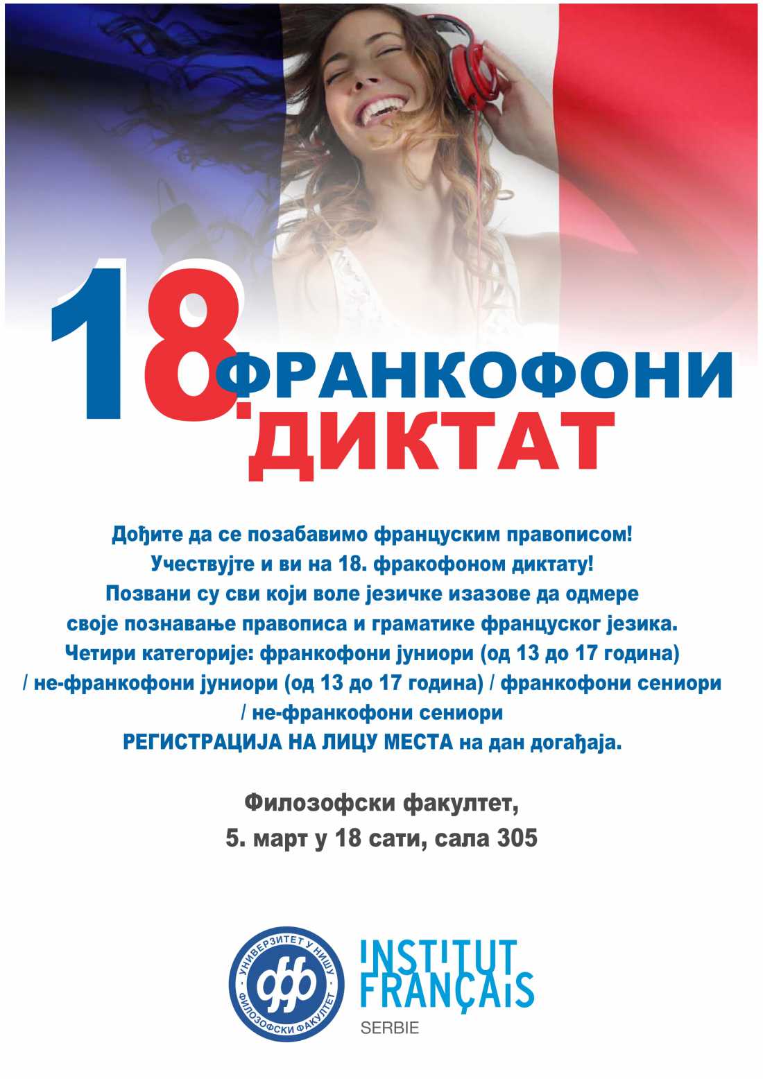 Филозофски факултет у Нишу и Француски институт организују 18. Франкофони диктат, 5. марта у 18 сати, сала 305.