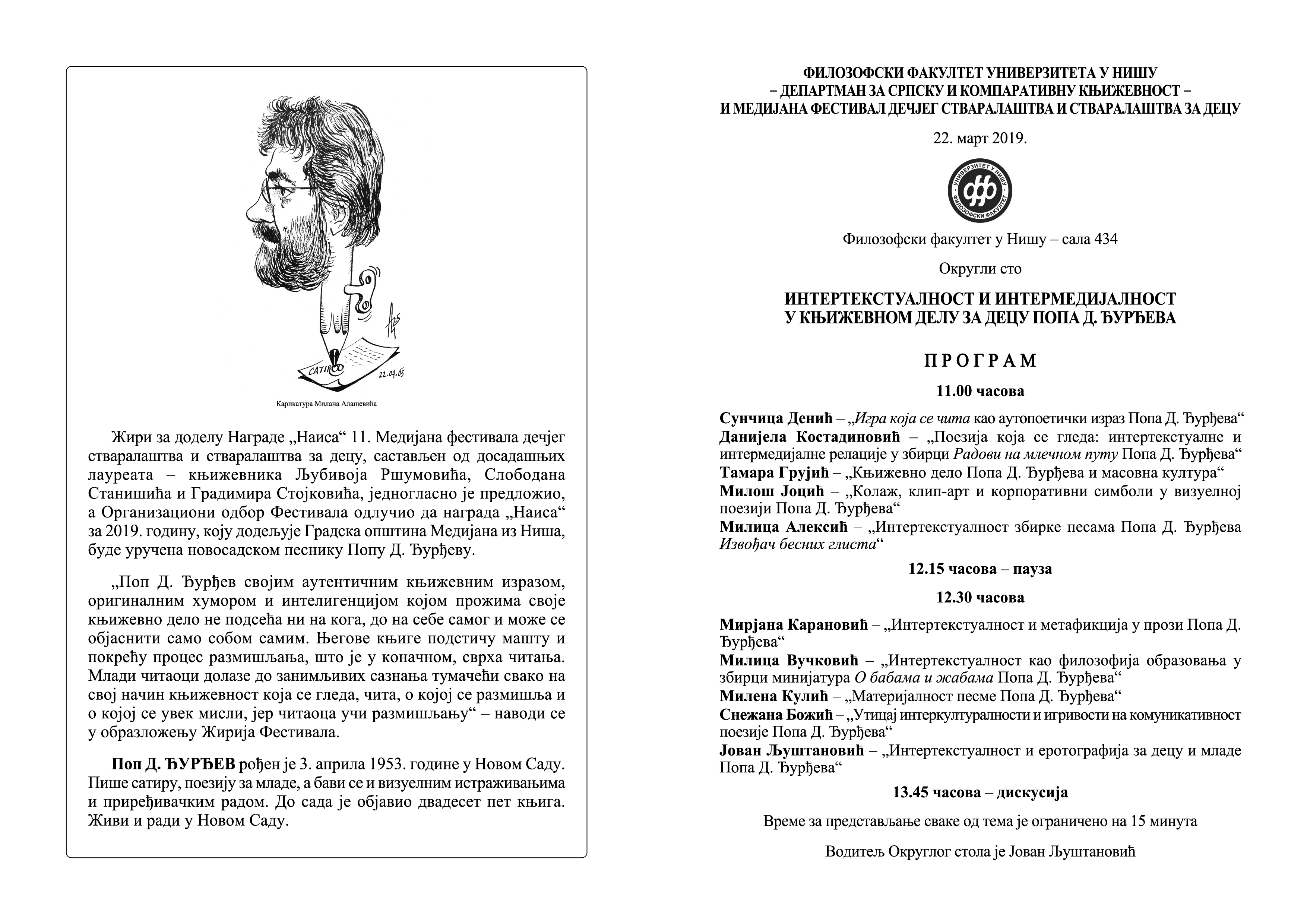 Департман за српску и компаративну књижевност Филозофског факултета у Нишу у сарадњи са Медијана фестивалом дечјег стваралаштва и стваралаштва за децу организује Округли сто под називом Интертекстуалност и интермедијалност у књижевном делу за децу Попа Д.Ђурђева.