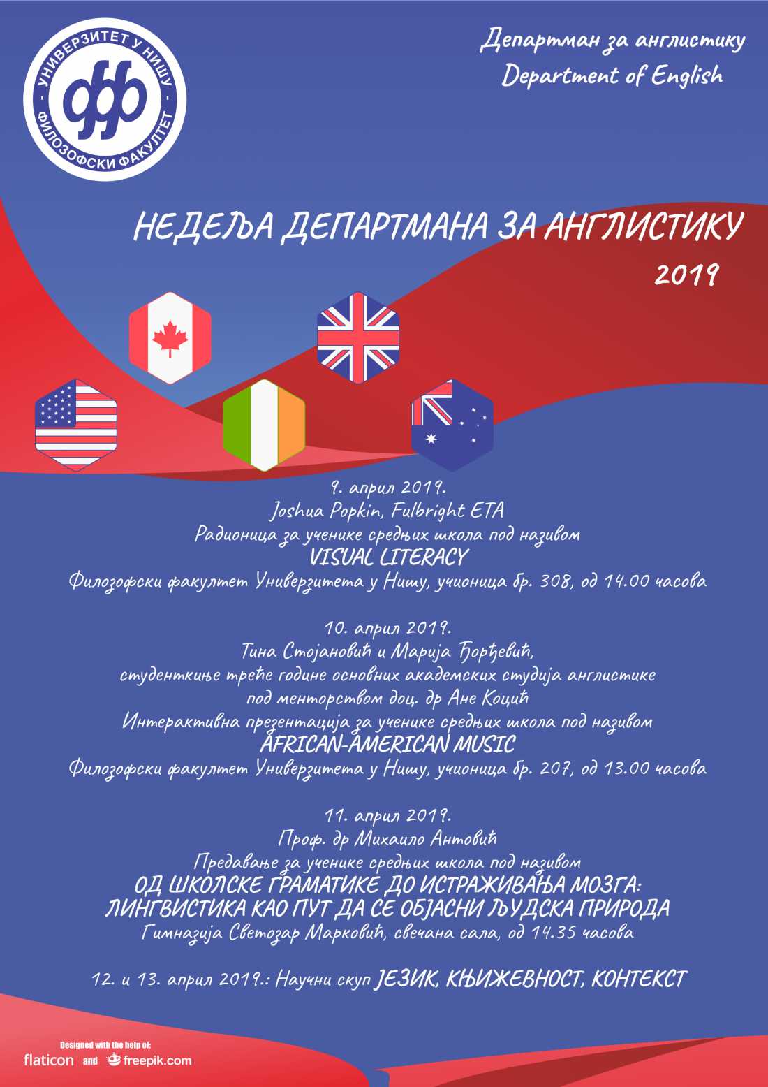 Обавештавамо вас да ће се Недеља Департмана за англистику Филозофског факултета у Нишу одржати у периоду од 9. до 13. априла 2019. године према следећем програму: