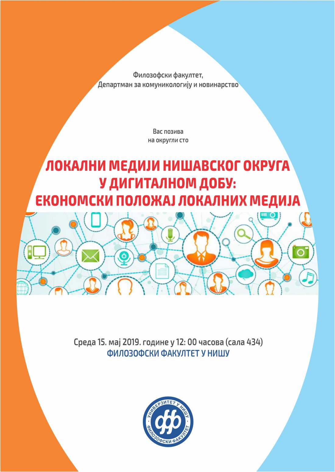 Департман за комуникологију и новинарство Филозофског факултета у Нишу Вас позива на округли сто Локални медији Нишавског округа у дигиталном добу: економски положај локалних медија у среду, 15. маја у 12:00 часова (сала 434).
