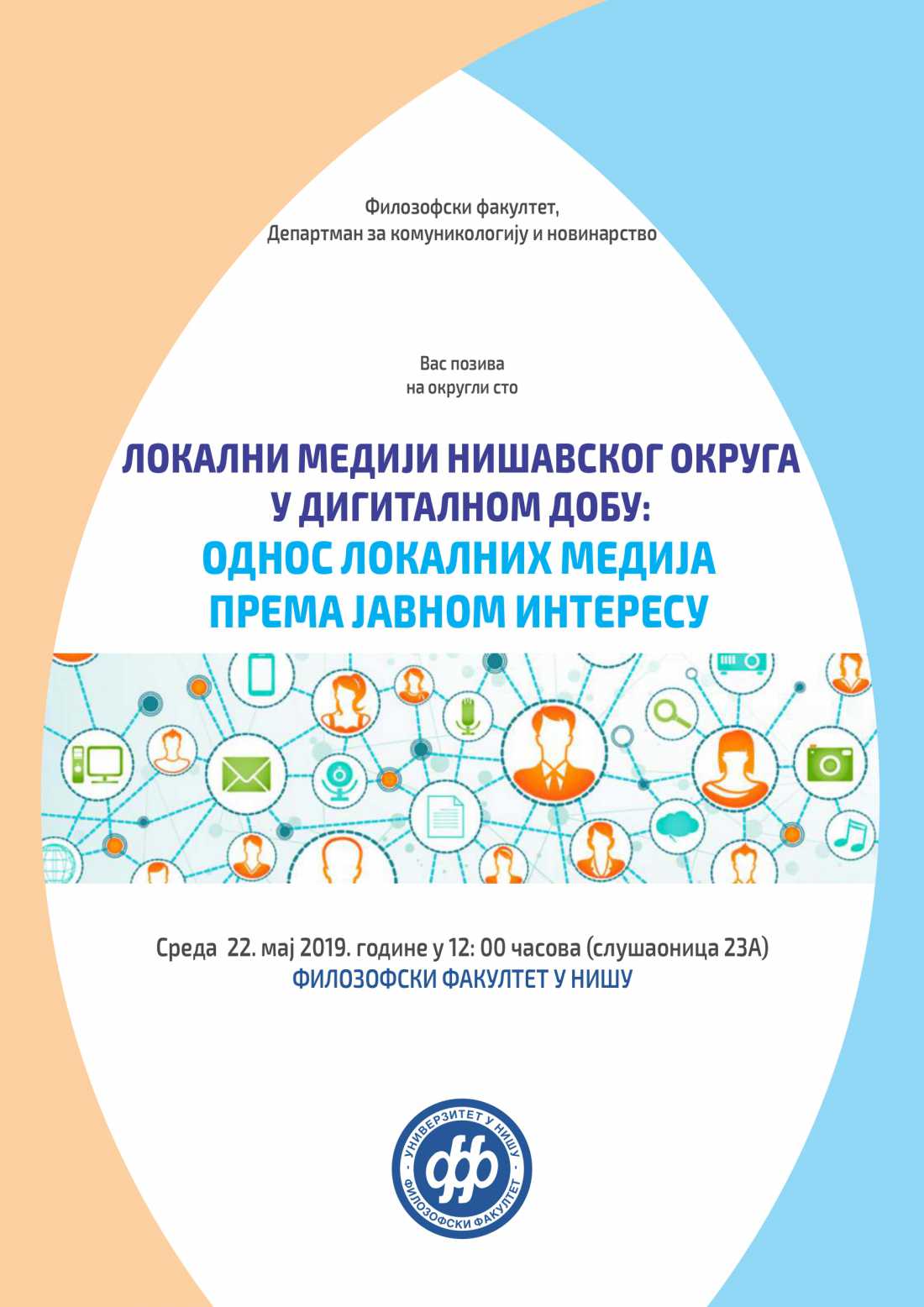 Најаве :: уторак, 21.05.2019.Департман за комуникологију и новинарство Филозофског факултета у Нишу Вас позива на округли сто Локални медији Нишавског округа у дигиталном добу: однос локалних медија према јавном интересу у среду, 22. маја у 12:00 часова (слушаоница 23А).