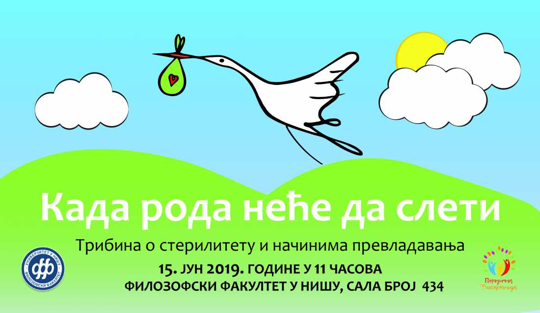 Филозофски факултет у Нишу и Удружење Породична филхармонија Вас позивају на трибину Када рода неће да слети. Трибина је посвећена проблему стерилитета и начинима превладавања.