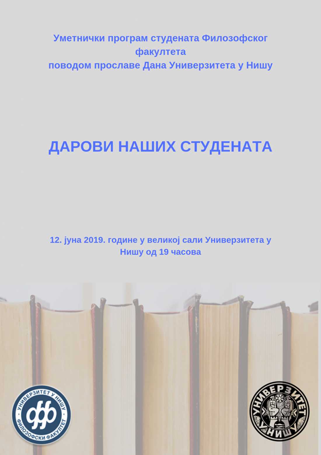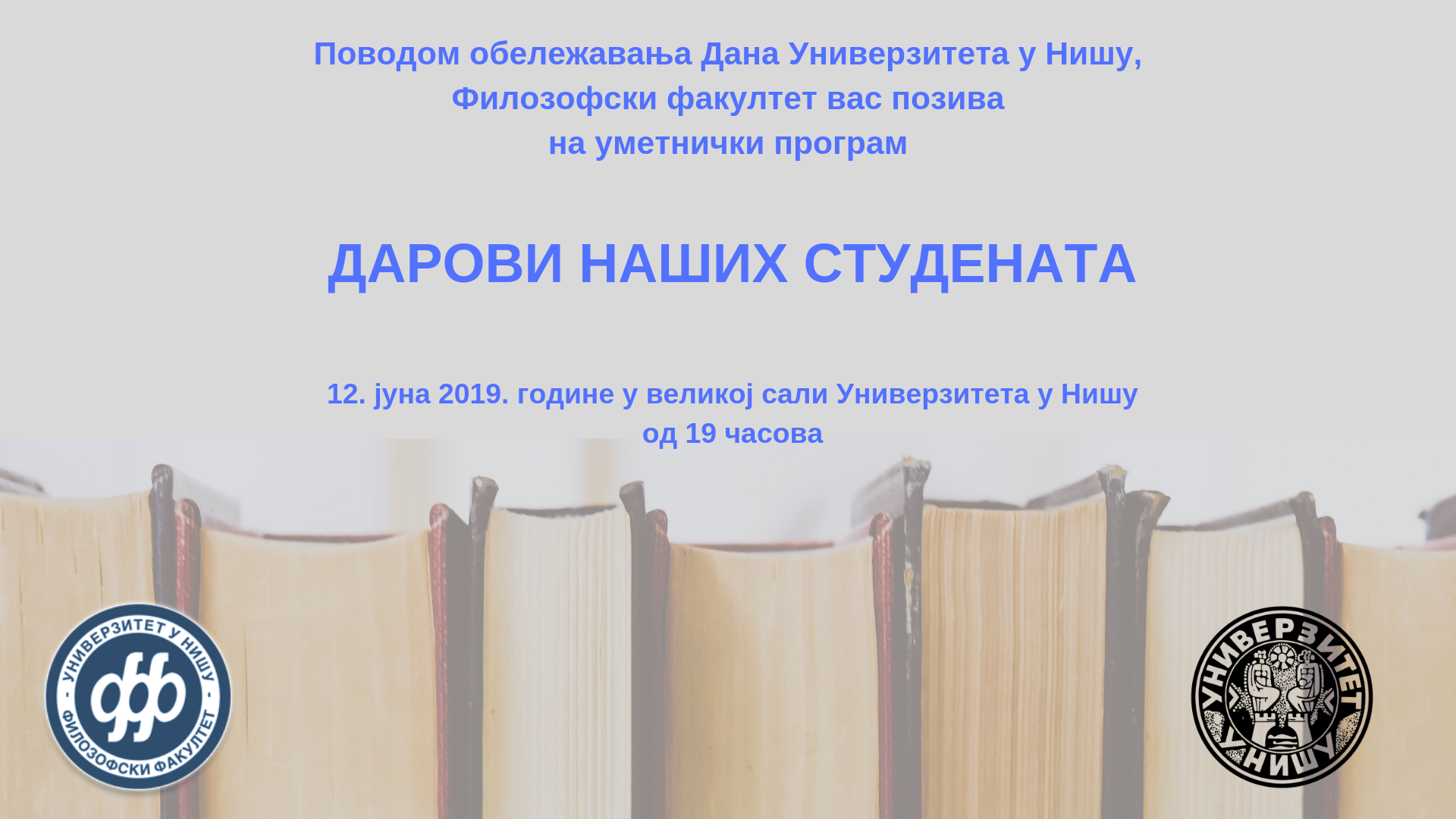 Позивамо вас да у среду 12. јуна 2019. године у свечаној сали Универзитета у Нишу од 19 часова присуствујете уметничком програму који су за вас припремили.