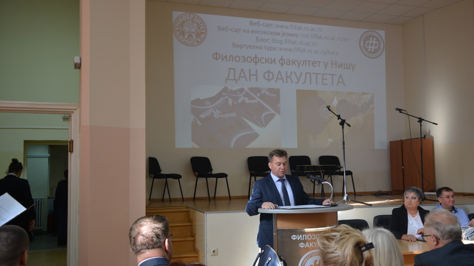 У име Ректората Универзитета у Нишу гостима се обратио проректор за науку и издавачку делатност проф. др Јован Степановић. Према његовим речима, Филозофски факултет веома је важан за нишки Универзитет - не само због чињенице да годинама привлачи највећи број студената, већ и због традиције која гарантује највише образовнне и научне стандарде и спремности наставника, сарадника и студената да константно унапређују поље друштвено-хуманистичких наука. То је, закључује, веома важно када се ради о изазовима савременог света.
