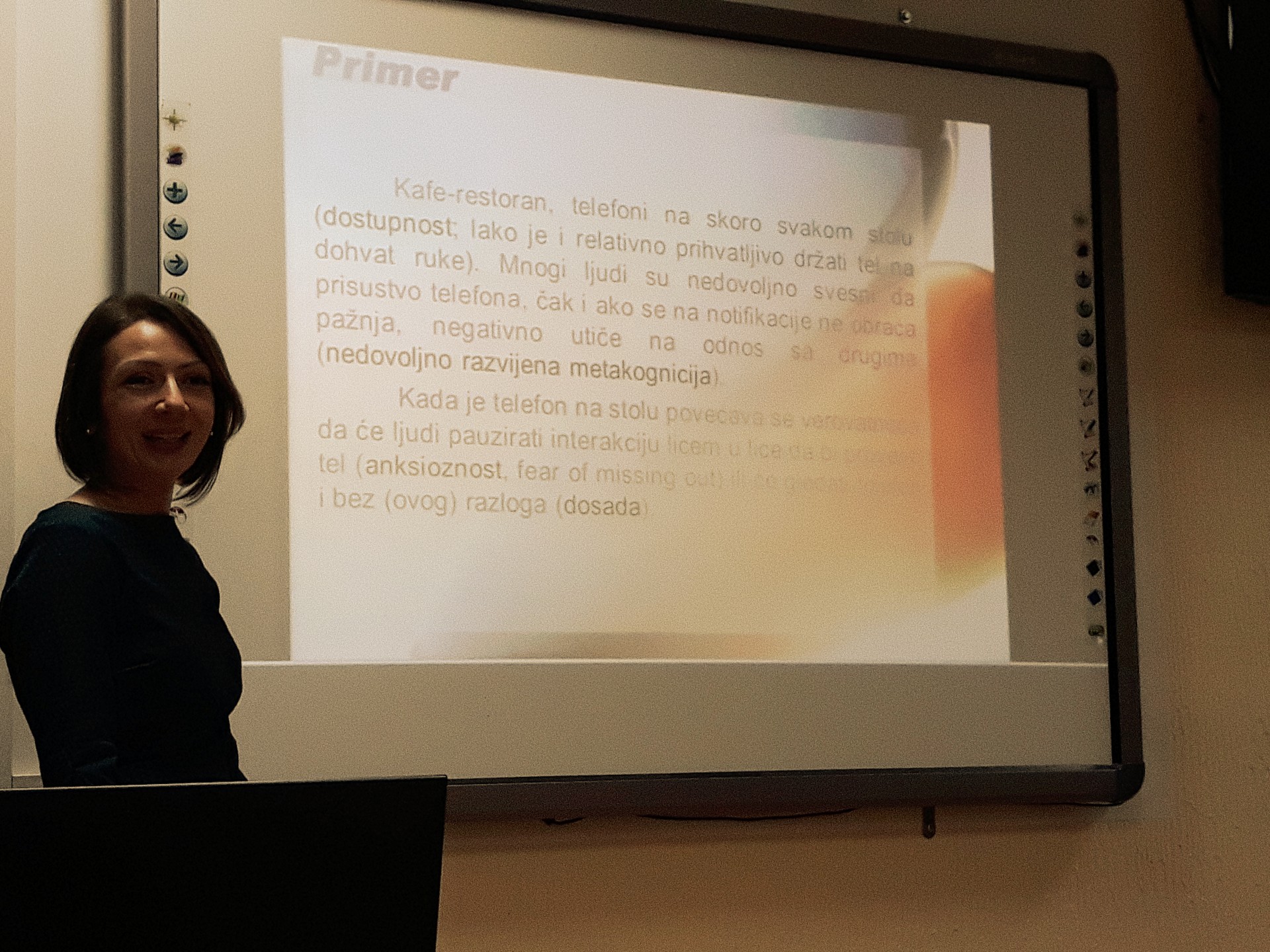 Током семинара разматрана су најважнија питања употребе паметних телефона адолесцената и одраслих: употреба ИКТ и могући утицаји на развој; које потребе мобилни телефон задовољава и за шта се најчешће користи; употреба мобилног телефона у друштву других и да ли је употреба мобилног телефона бег од комуникације; нови појмови у психологији – афективна везаност за телефон; страх од раздвојености/губљења телефона, „одсутно присуство“. Поред тога, учесници су имали прилике да своје искуство из праксе размене и упореде са резултатима истраживања на узорку средњошколаца из Ниша, које се бавило питањем да ли постоје назнаке да употреба телефона и друштвене мреже имају негативне ефекте на однос са пријатељима. У завршном делу сусрета било је речи о томе како сачувати себе од прекомерне употребе паметног телефона, а кроз дискусију су сагледане различите могућности за модификовање понашања. Сви присутни су изразили велико задовољство семинаром и проценили да је, како за наставничку праксу, тако и за свакодневно функционисање, корисно разумевање односа који људи данас имају према својим мобилним телефонима и могућих последица те везе.