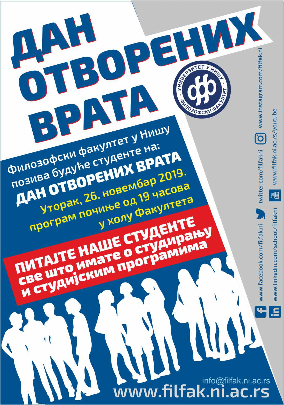 Позивамо вас на други Дан отворених врата Филозофског факултета у Нишу у овој школској години који ће бити организован у уторак, 26. новембра, од 19 сати.