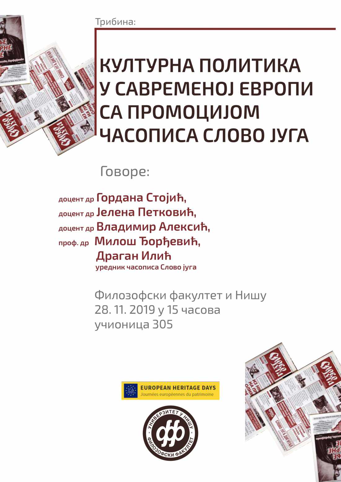 Трибина "Културна политика у савременој Европи са промоцијом часописа Слово југа" биће одржана на Филозофском факултету у Нишу у четвртак, 28. новембра, са почетком у 15 сати у учионици 305.