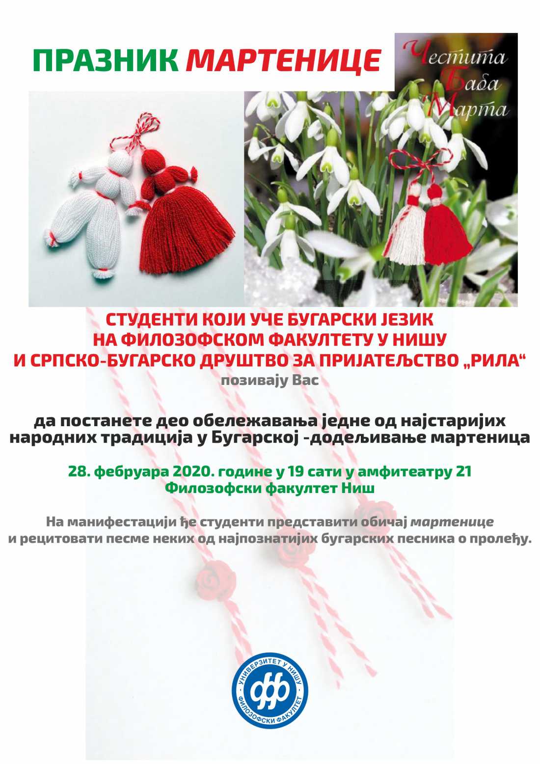 Традиционално бугарско вече посвећено мартеницама и ове године биће одржано на Филозофском факултету у петак, 28. фебруара од 19 сати у амфитеатру 21.