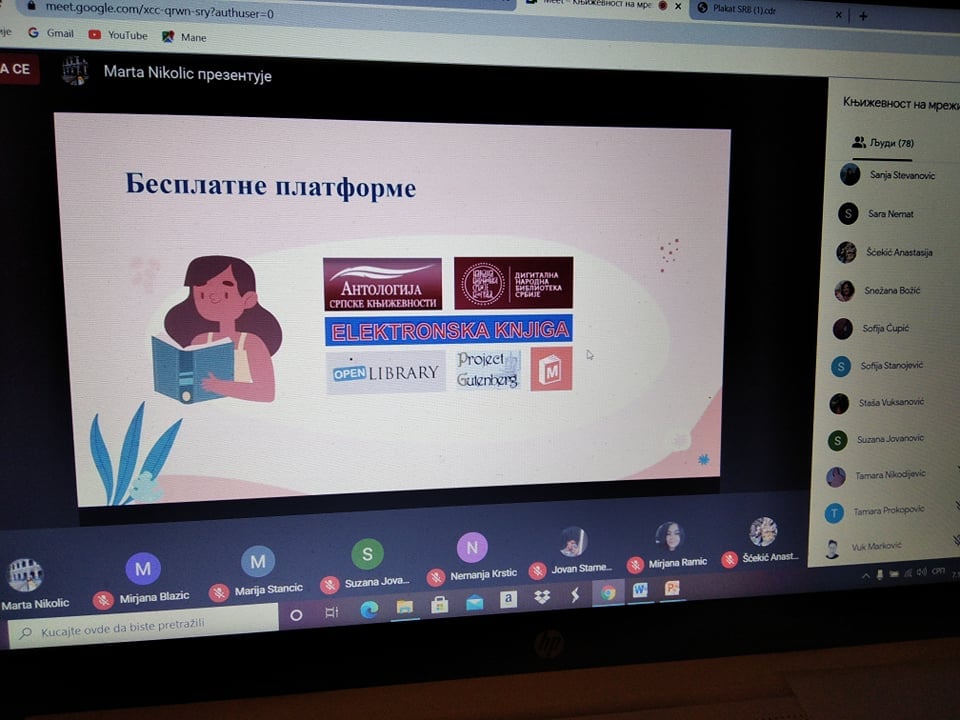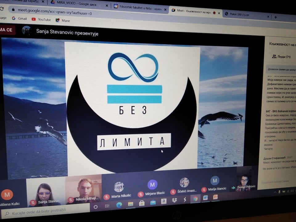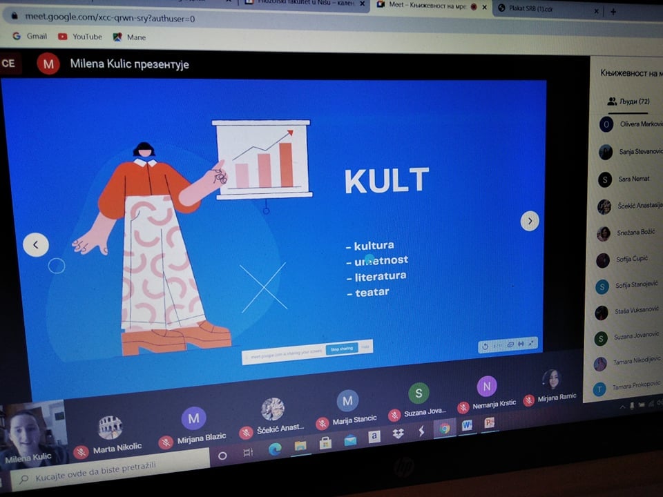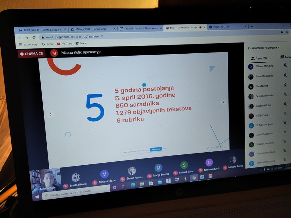 Већ првог дана Недеље Србистике, онлајн-трибина Књижевност на мрежи, чији је организатор била доц. др Мирјана Бојанић Ћирковић у сарадњи са Маријом Станчић, професором Српског језика и књижевности у Гимназији „Бора Станковићˮ у Нишу и Гимназији „Светозар Марковићˮ у Нишу, привукла је огромну пажњу публике. Мисао водиља овогодишње трибине била је: Књижевност је мрежа која никада не пуца. Представљено је више средњошколских и студентских часописа из целе Србије: Арго Арт (Гимназија у Куршумлији), Борополитен (Гимназија „Бора Станковићˮ у Нишу), Гроги (Гимназија „Светозар Марковићˮ у Нишу), Економист (Економска школа из Ниша), (Им)пулс (Средња школа „Прокоповићˮ у Нишу), Искра (Гимназија у Пироту), Средњошколац (Средња школа Коцељева), Балкански књижевни гласник, Култ (Нови Сад), Др Филстуд (Филозофски факултет у Приштини с привременим седиштем у Косовској Митровици) и Без лимита (Филозофски факултет Универзитета у Нишу). Тридесет и осам учесника из редова професора средњих школа, ученика, студената основних студија Србистике и мастер студија Филологије, те уредника електронских и штампаних књижевних часописа показало је шта је електронска књижевност и које су њене специфичности. Публика од шездесетак гостију учествовала је у занимљивој и плодотворној дискусији, која обећава наставак сарадње и даље умрежавање. Због великог интересовања, излагања учесника биће емитована на страници Србистике на Фејсбуку током децембра 2020. и јануара 2021. године.