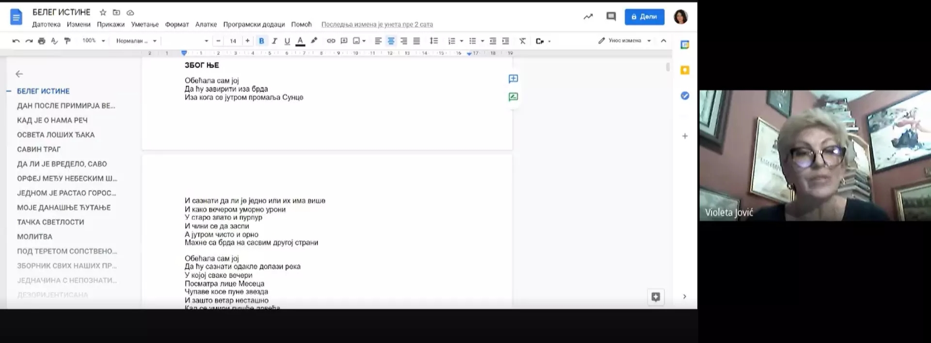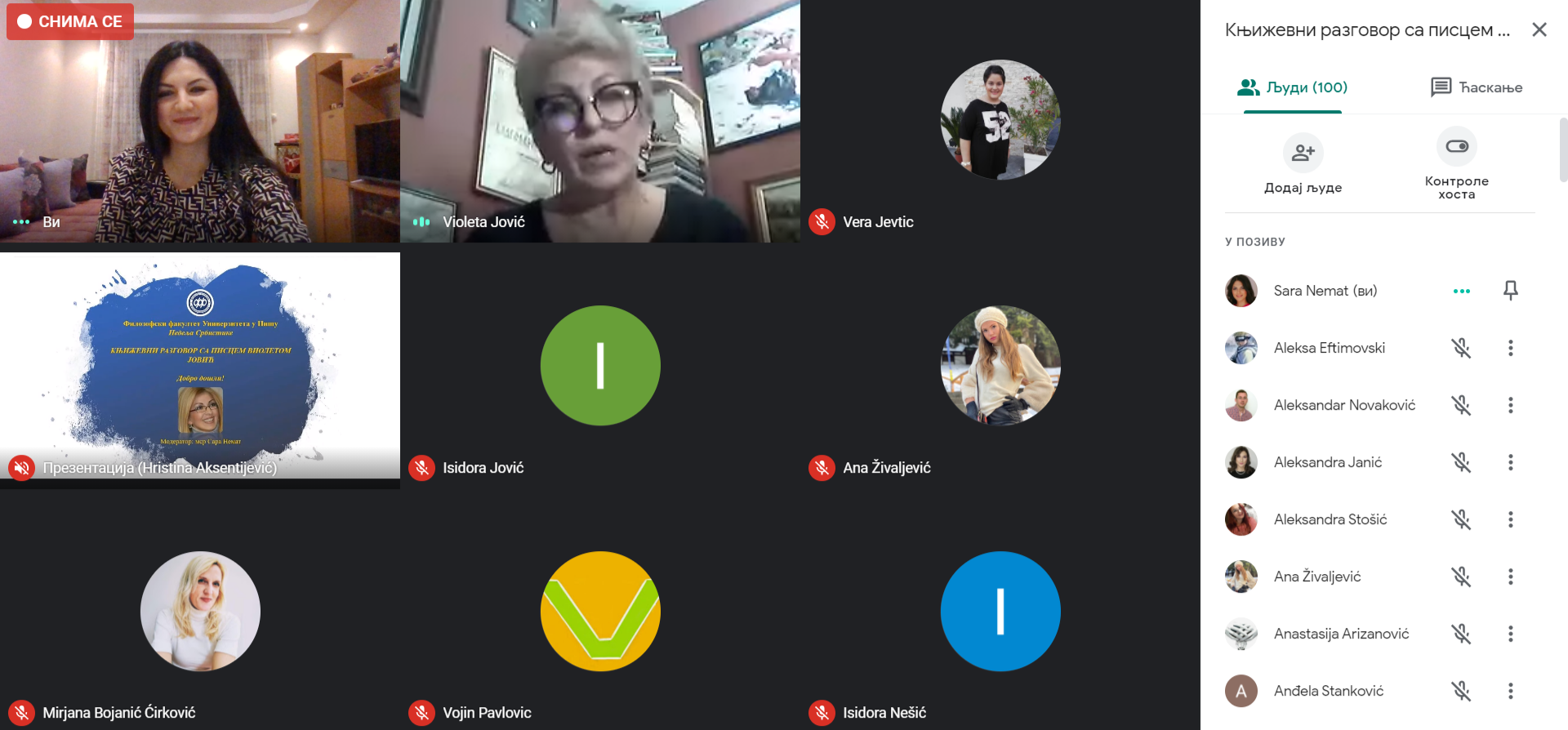 Другог дана одржан је Књижевни разговор са Виолетом Јовић, који је онлајн водила мср Сара Немат. Књижевној вечери присуствовали су професори, сарадници и студенти Филозофског факултета у Нишу, професори и ученици Гимназије „Светозар Марковић” и Гимназије „Бора Станковић” из Ниша, као и бројна читалачка публика од око стотину учесника. Ученица Гимназије „Светозар Марковић” имала је уводну реч у најави Виолете Јовић и упознала је публику са стваралачком биографијом ауторке. Током књижевног разговора, писац Виолета Јовић читала је поезију, говорила о индивидуалној стваралачкој поетици, испричала занимљиве анегдоте из живота и стрпљиво одговарала на бројна питања заинтересоване младе читалачке публике. Ауторка је током књижевне вечери открила да својом биографском песмом сматра Ршумовићеву песму У пољу где се чавке чавче, која је настала у њеном детињству. На основу мишљења да треба очувати дете у себи, попут Малог Принца, ауторка је малој себи посветила песму Због ње, коју је премијерно прочитала на овој књижевној вечери. Виолета Јовић посведочила је да највећи изазов приликом чина писања за њу представља брушење идеје, а будућим младим ствараоцима поручила је да читају, јер ће на тај начин изградити непоколебљиви темељ за своје књижевно стваралаштво. Посебан поздрав Виолети Јовић упутила је доц. др Татјана Трајковић, ментор бројних семинарских, дипломских и мастер радова заснованих на грађи из ауторкиног књижевног опуса, као и ученици програма интернационалне матуре Гимназије „Светозар Марковић”.