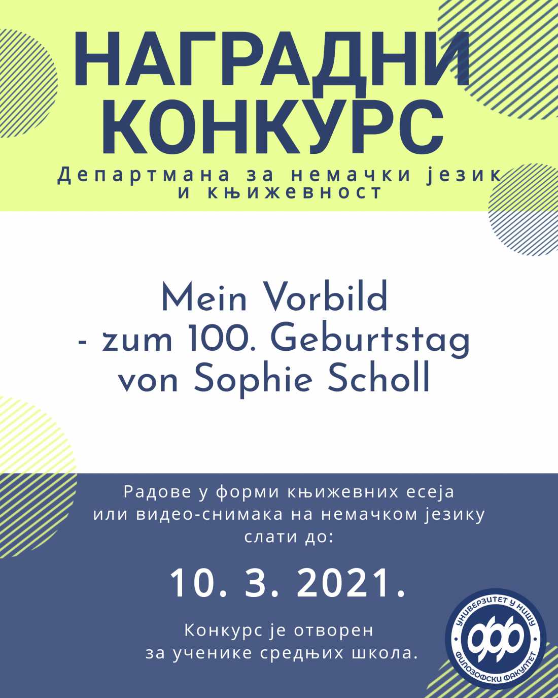 Департман за немачки језик и књижевност Филозофског факултета у Нишу организује наградни књижевни/видео конкурс на тему Mein Vorbild – zum 100. Geburtstag von Sophie Scholl.