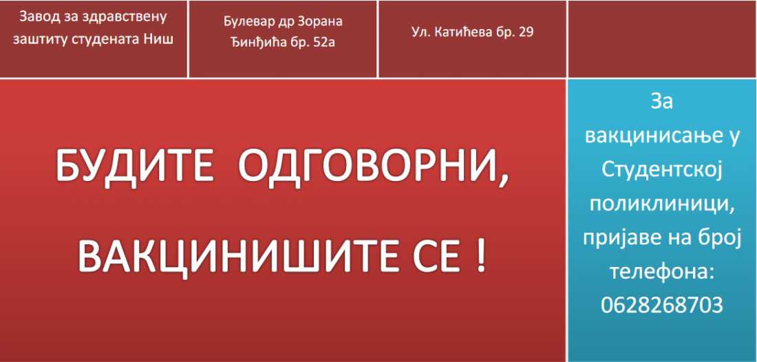 Уколико желите да вакцину примите у Заводу за здравствену заштиту студената, потребно је да се пријавите на број телефона 062 82 68 703.