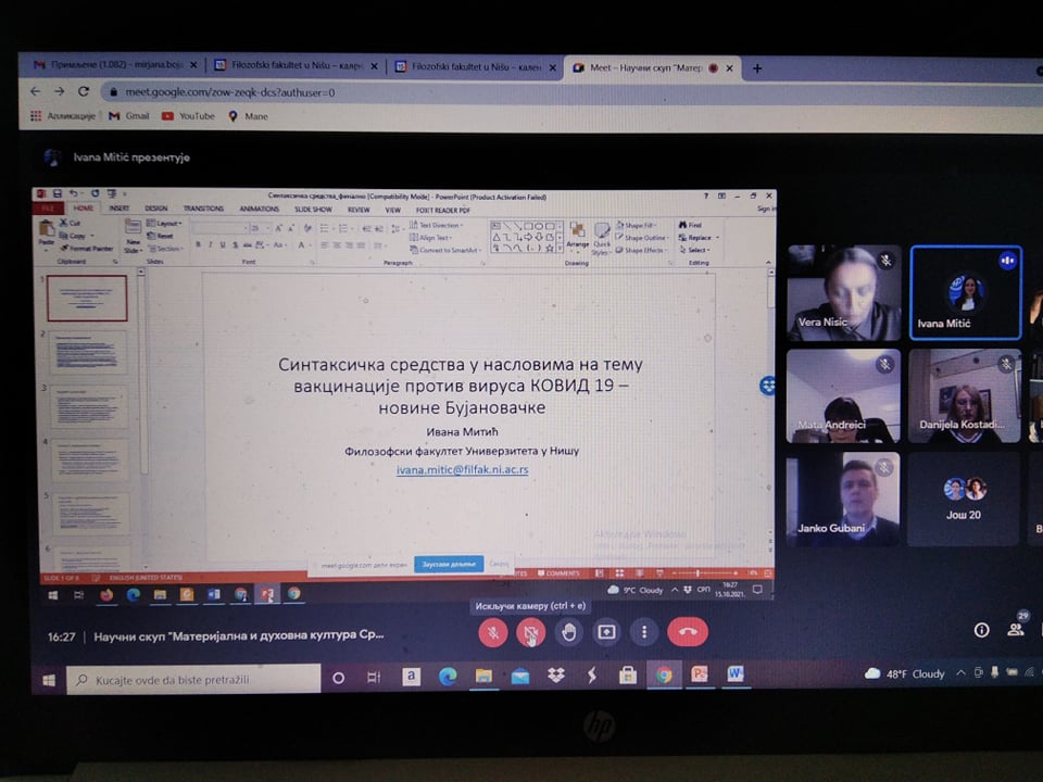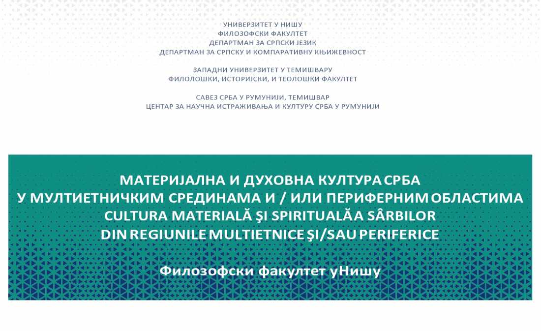 Континуитет сарадње Департмана за србистику Филозофског факултета у Нишу са Западним универзитетом у Темишвару и Савезом Срба у Румунији одржава се и организовањем научног скупа „Материјална и духовна култура Срба у мултиетничким срединама и/или периферним областима". Упркос отежавајућим околностима изазваних епидемијом, 15. 10. 2021. године у онлајн-форми одржан је осми међународни научни скуп регионалног карактера, на којем је своја научна истраживања разменило тридесет четворо учесника из Босне и Херцеговине, Србије и Румуније. Пленарни предавачи осмог научног скупа „Материјална и духовна култура Срба у мултиетничким срединама и/или периферним областима" били су проф. др Јордана Марковић, проф. др Михај Радан, доц. др Миљана Радмила Ускату и декан Филозофског факултета Универзитета у Источном Сарајеву проф. др Драга Мастиловић. Научни скуп отворили су проф др Владимир Хедрих, продекан за међународну сарадњу Филозофског факултета у Нишу, Огњан Крстић, председник Савеза Срба у Румунији, проф. др Михај Радан и проф. др Мирјана Илић, управник Департмана за србистику Филозофског факултета Универзитета у Нишу. У уводном делу научног скупа проф. др Горан Максимовић и проф. др Михај Радан у својству уредника представили су седми број часописа Исходишта/Originations, публикације у којој се континуирано објављују реферати са овог научног скупа.