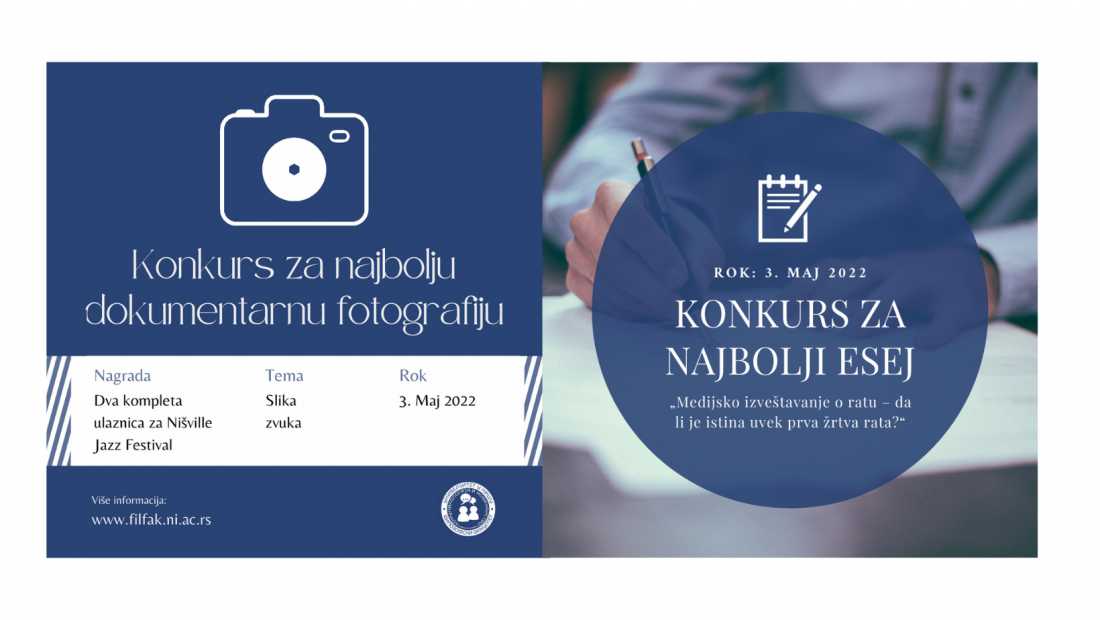 - Конкурс за најбољи есеј на тему „Медијско извештавање о рату – да ли је истина увек прва жртва рата?“ Први рат на територији Европе у 21. веку отпочео је пре непуна два месеца. Ратови 20. и 21. века су хибридног карактера с обзиром на то да их не одликује употреба само војних метода, већ и пласирање пропагандних порука, увођење санкција, лажних вести и сличног материјала. Напредак нових технологија омогућава много лакшу производњу поменутог садржаја, при чему долази до осмишљавања властите истине која се као таква нуди народу. Своје ставове, запажања и закључке можете изнети у есеју дужине до 2 стране А4 формата. Овај конкурс је намењен ученицима средњих школа.