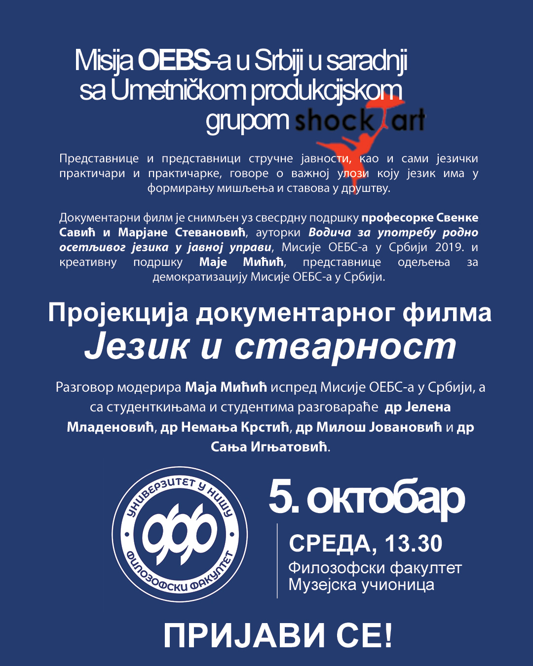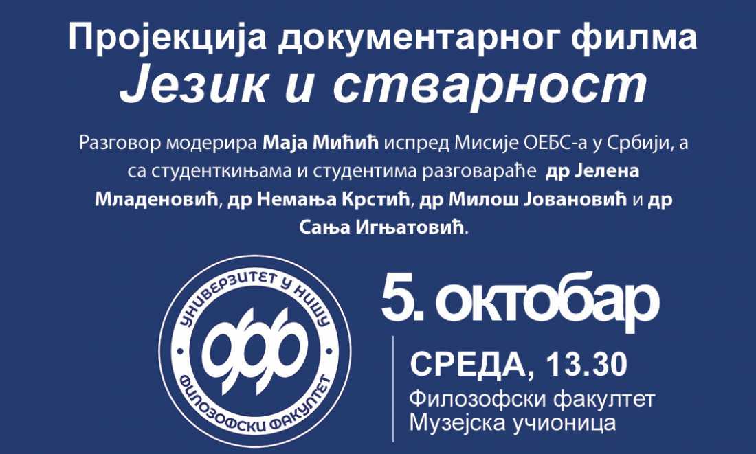 Петог октобра са почетком у 13.30, у Музејској учионици Филозофског факултета у Нишу, одржаће се пројекција документарног филма Језик и стварност. У њему представнице и представници стручне јавности, као и сами језички практичари и практичарке, говоре о важној улози коју језик има у формирању мишљења и ставова у друштву.