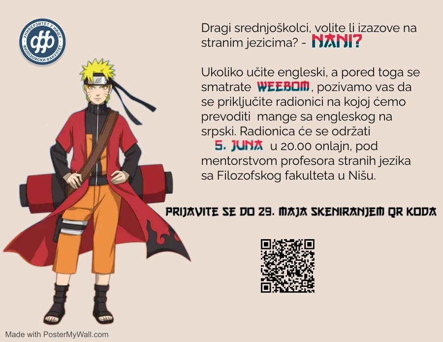 Пријавите се кликом на линк: https://forms.gle/3KBxHRKa2sSdqV3u6 или скенирањем QR кода на постеру у прилогу.