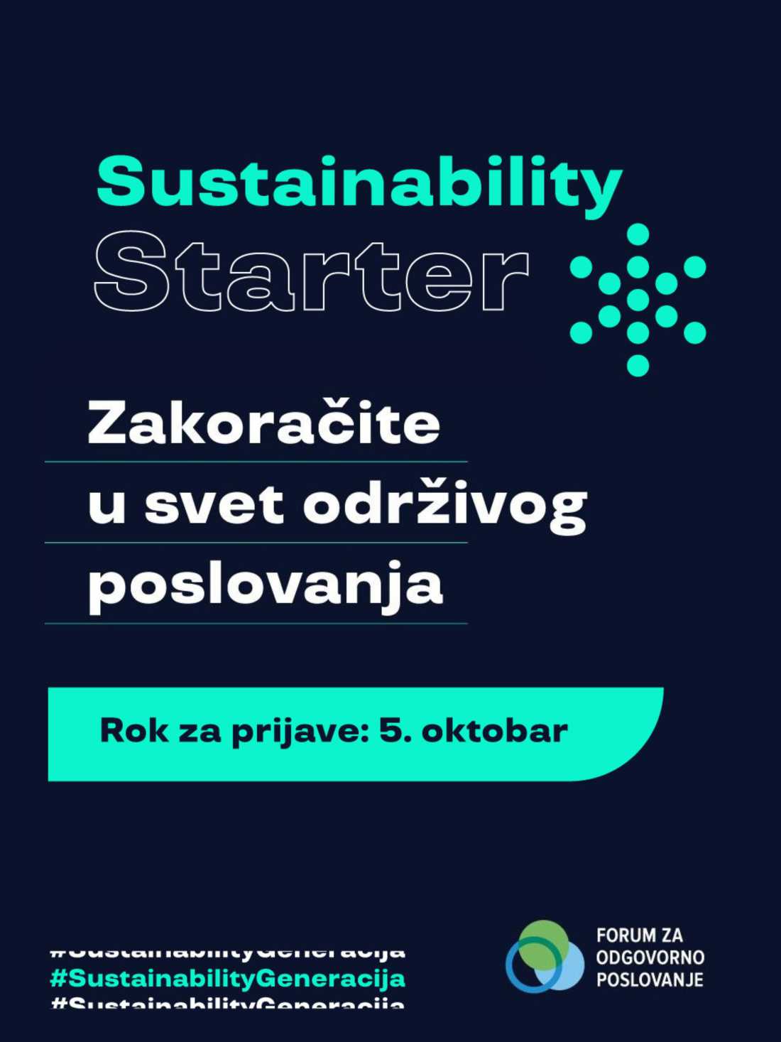 Форум за одговорно пословање позива дипломце и студенте завршних година и мастер студија да се пријаве за Sustainability Starter - едукативни програм за стицање практичних знања неопходних за развој каријере у области одрживости и друштвено одговорног пословања.