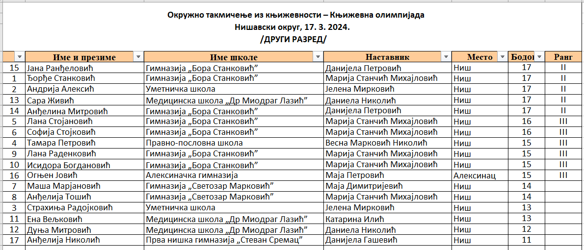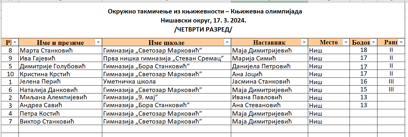 Резултати окружног нивоа Књижевне олимпијаде за средњошколце из Нишавског округа (2024)