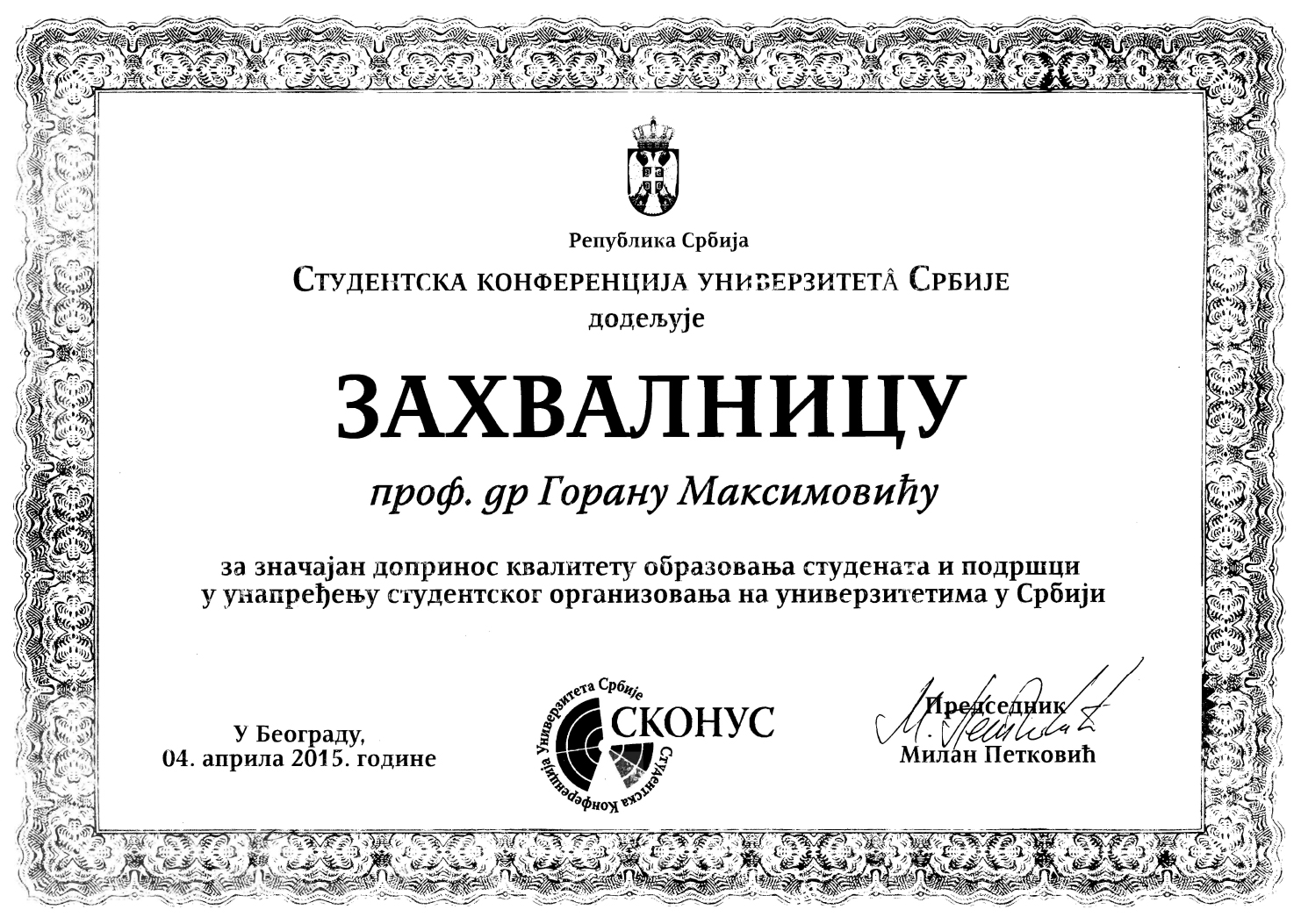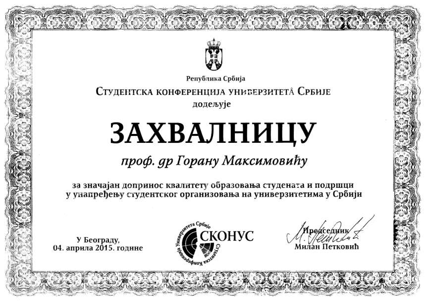 У петак (3. априла), поводом обележавања Дана студената 4. април, СКОНУС (Студентска конференција универзитета Србије) доделила је декану Филозофског факултета Универзитета у Нишу, проф. др Горану Максимовићу, ЗАХВАЛНИЦУ за значајан допринос квалитету образовања студената и подршци у унапређењу студентског организовања на универзитетима у Србији.