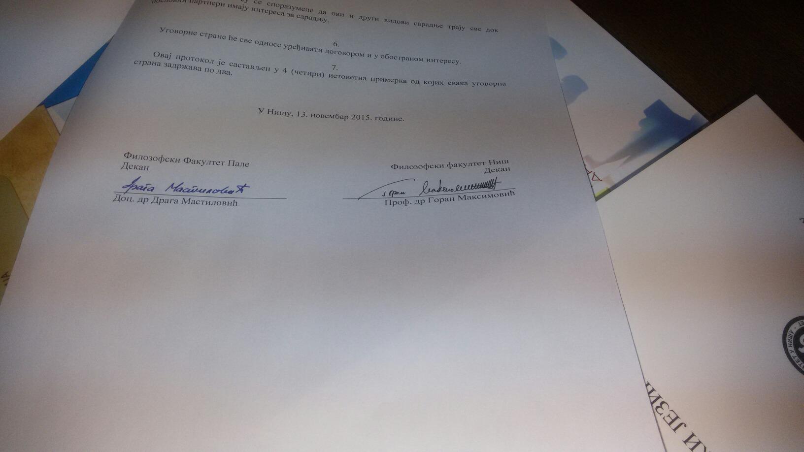 У петак, 13. новембра 2015. године, декан Филозофског факултета у Нишу, проф. др Горан Максимовић, потписао је са деканом Филозофског факултета у Источном Сарајеву, доц. др Драгом Мастиловићем, Протокол о пословној сарадњи.