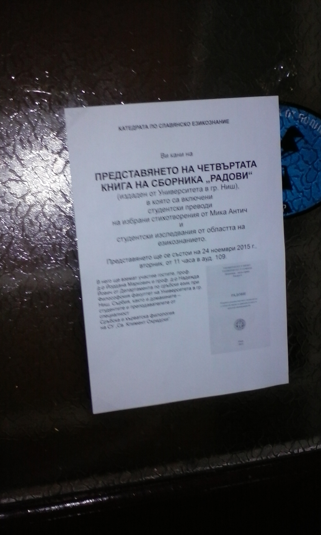 У оквиру сарадње између нишког и софијског универзитета, проф. др Јордана Марковић, проф. др Надежда Јовић и мр Татјана Трајковић, са Департмана за српски језик, дана 24. 11. 2015. боравиле су на Универзитету «Св. Климент Охридски». Том приликом промовисан је зборник Радови, у којем су штампани радови студената ова два универзитета, а разговарано је и о другим видовима сарадње.