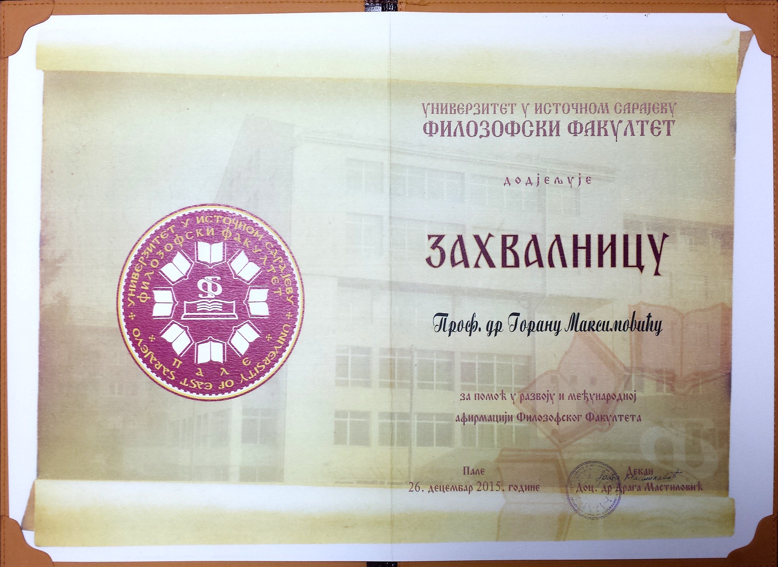 У суботу (26. децембра), декан Филозофског факултета, проф. др Горан Максимовић примио је ЗАХВАЛНИЦУ Филозофског факултета Универзитета у Источном Сарајеву за помоћ у развоју међународне афирмације ове високошколске институције Републике Српске. Захвалница је израз успешне и корисне заједничке сарадње и наступа Филозофског факултета Универзитета у Нишу и Филозофског факултета Универзитета у Источном Сарајеву на пољу међународне размене наставника и студената, те реализације заједничких научних и наставних пројеката са универзитетима у Француској и Русији.