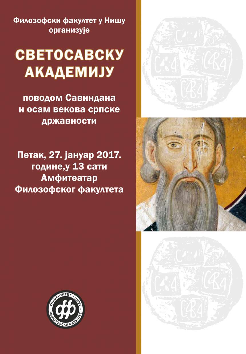 Филозофски факултет у Нишу организује Светосавску академију, поводом Савиндана и осам векова српске државности, која ће бити организована у петак, 27. јануара 2017. године, са почетком у 13 сати.