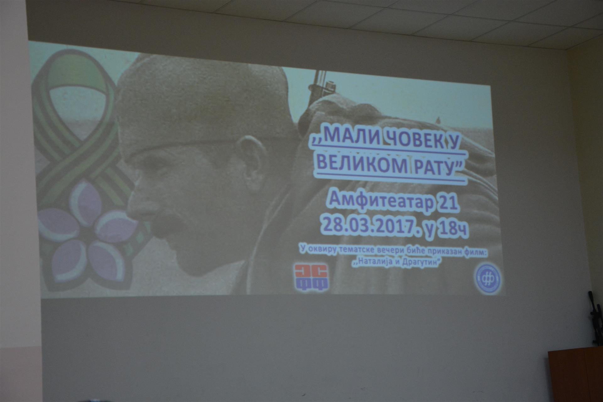 Како би подсетили јавност на велика страдања српског народа у Првом светском рату и како би сачували сећање на храбре људе који су живот дали за ову земљу, Департман за историју и Савез студената Филозофског факултета у Нишу организовали су тематско вече „Мали човек у Великом рату“.