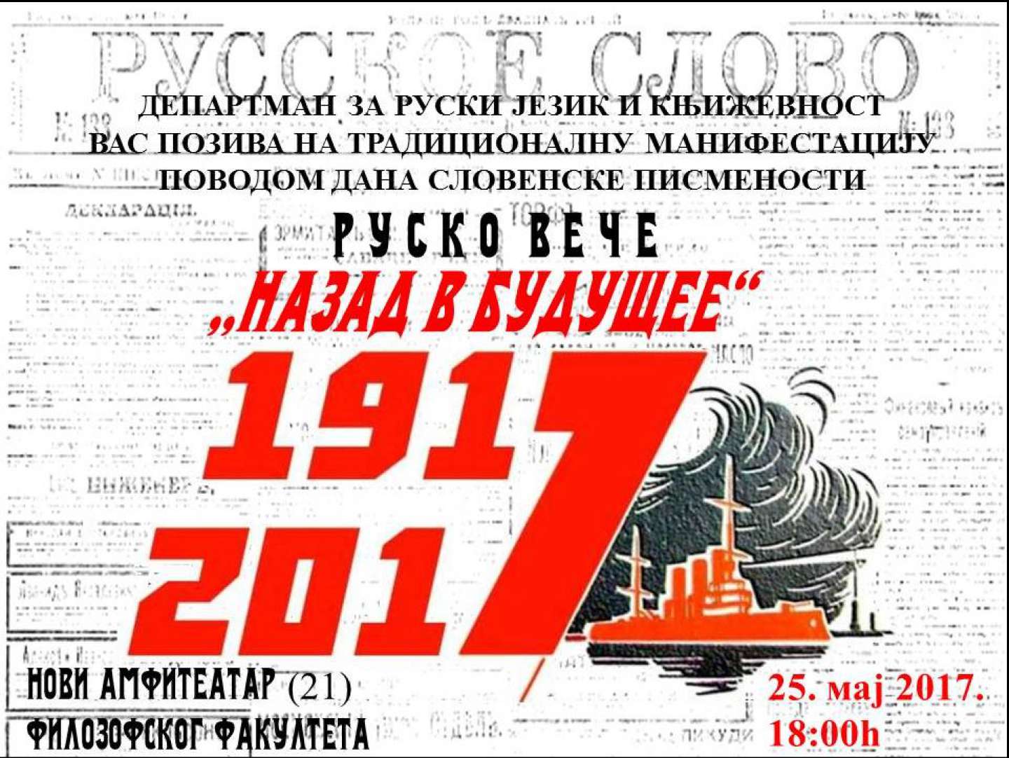 Поводом Дана словенске писмености студенти Департмана за руски језик и књижевност приредиће традиционалну манифестацију "Руско вече". Приредба ће ове године бити посвећена стогодишњици Октобарске револуције, као догађају који је битно утицао на руско друштво и културу током читавог XX века.