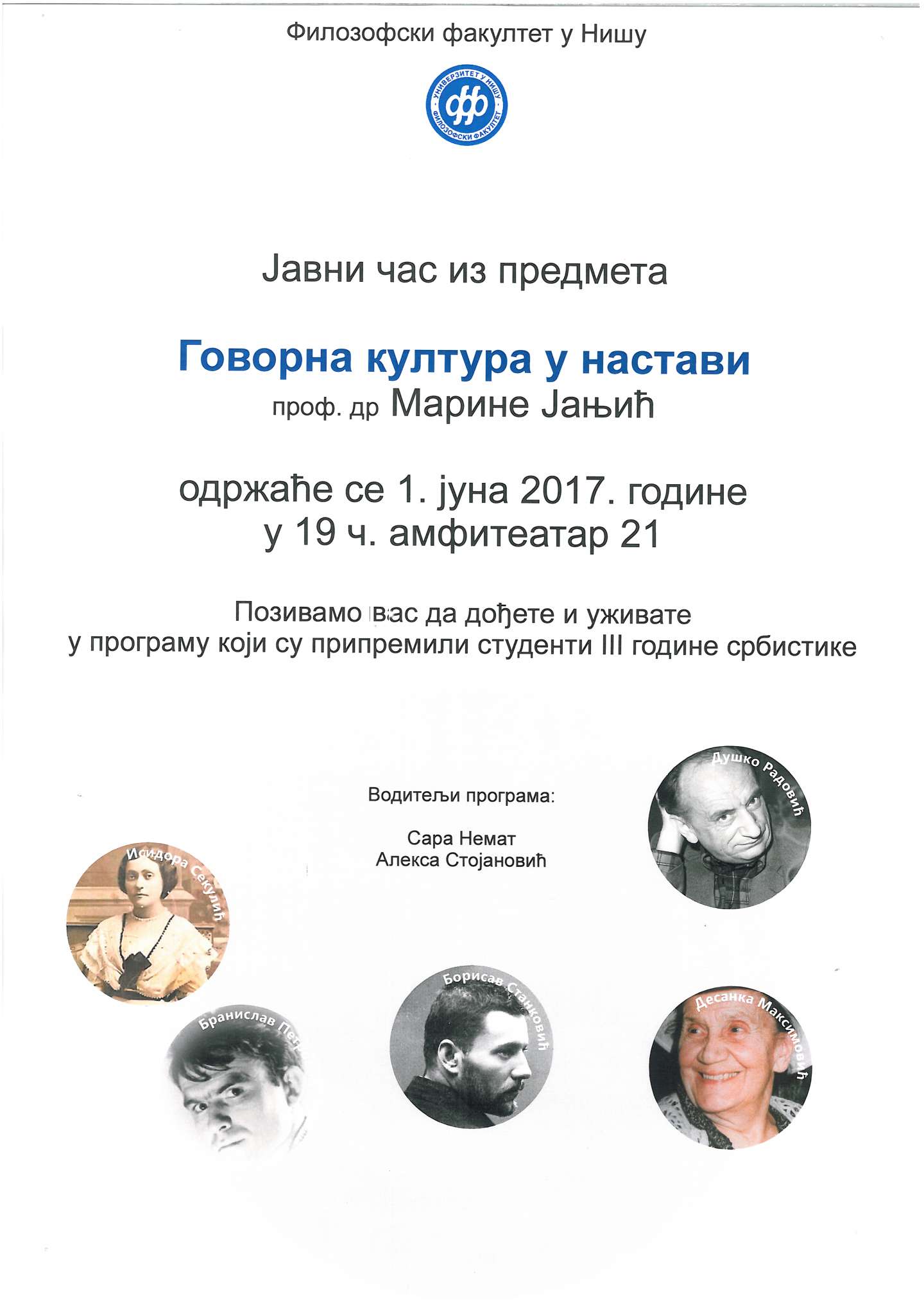 Под менторством проф. др Марине Јањић, управнице Департмана за српски језик, студенти треће године Србистике који су похађали курс Говорна култура у настави извешће јавни час у четвртак 1. 6. 2017. године од 19 часова у амфитеатру 21 Филозофског факултета у Нишу, уз музичку пратњу чланова бенда Филозофског факултета.